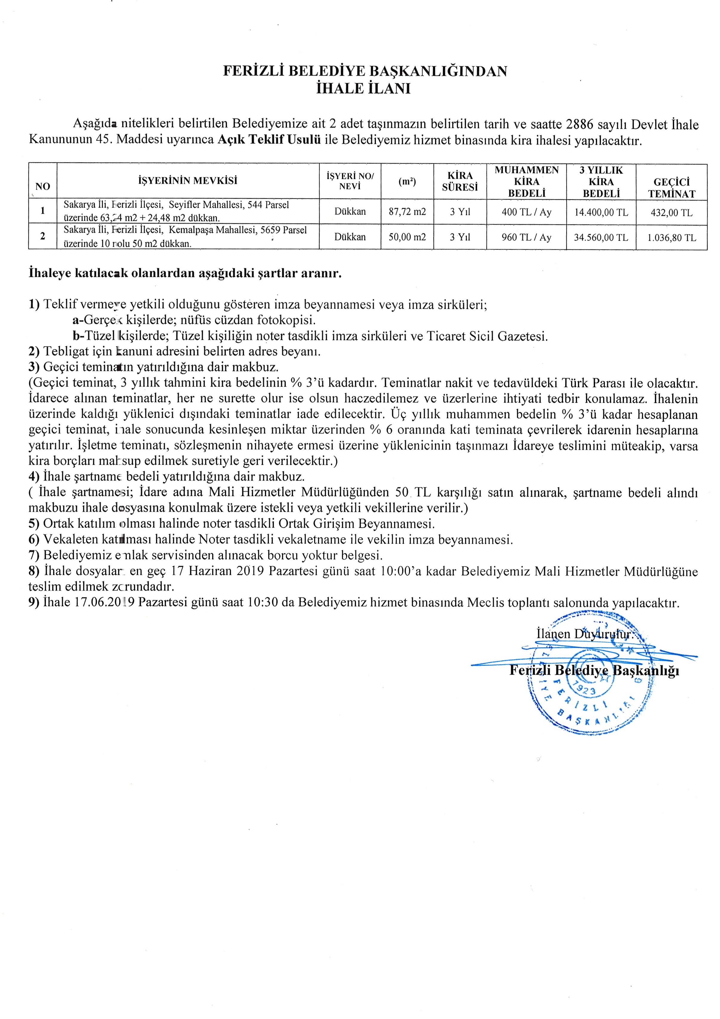 Ferizli Belediyesi İhale İlanı
