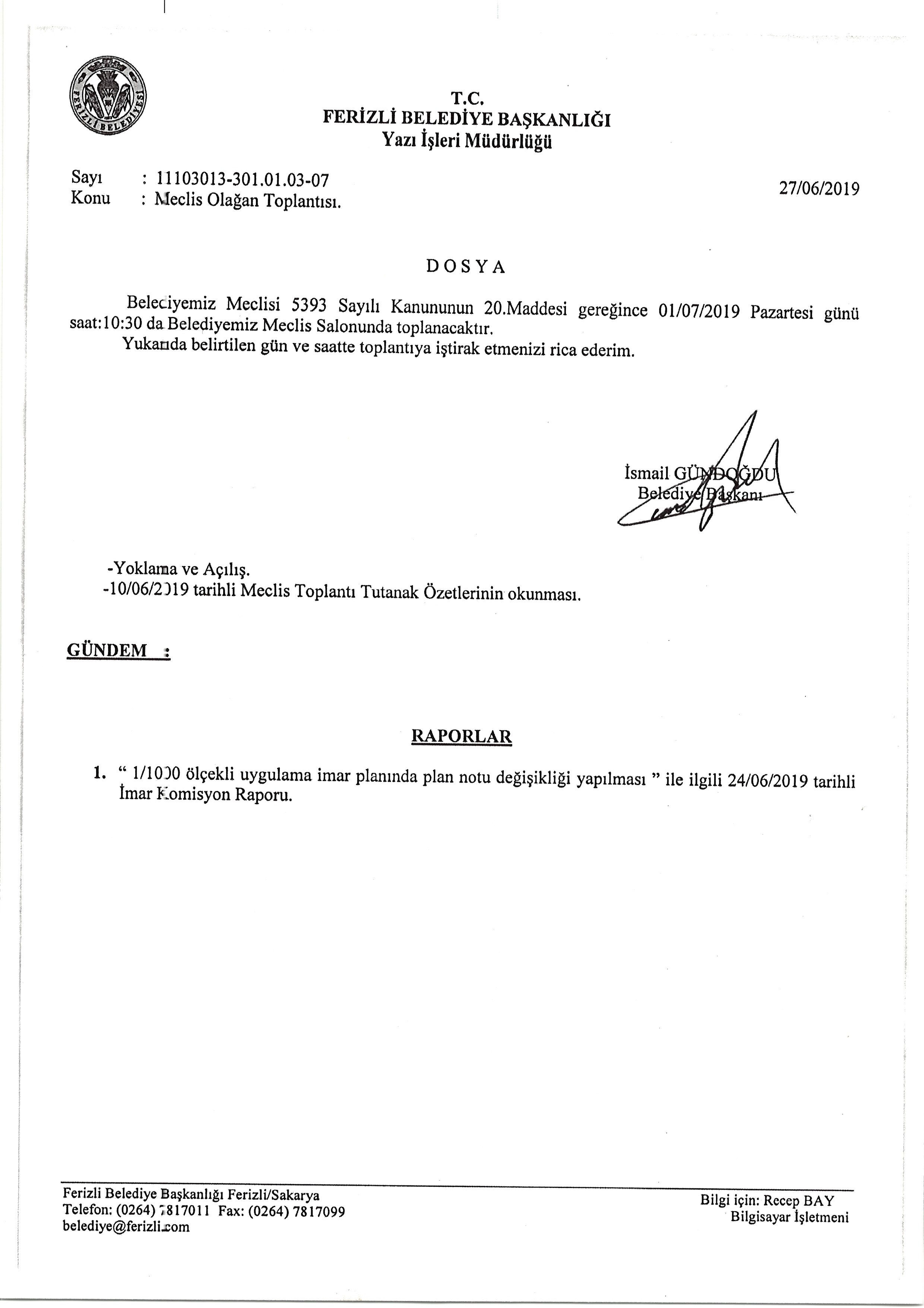 Ferizli Belediyesi Temmuz Ayı Meclis Gündemi (01.07.2019 Pazartesi)