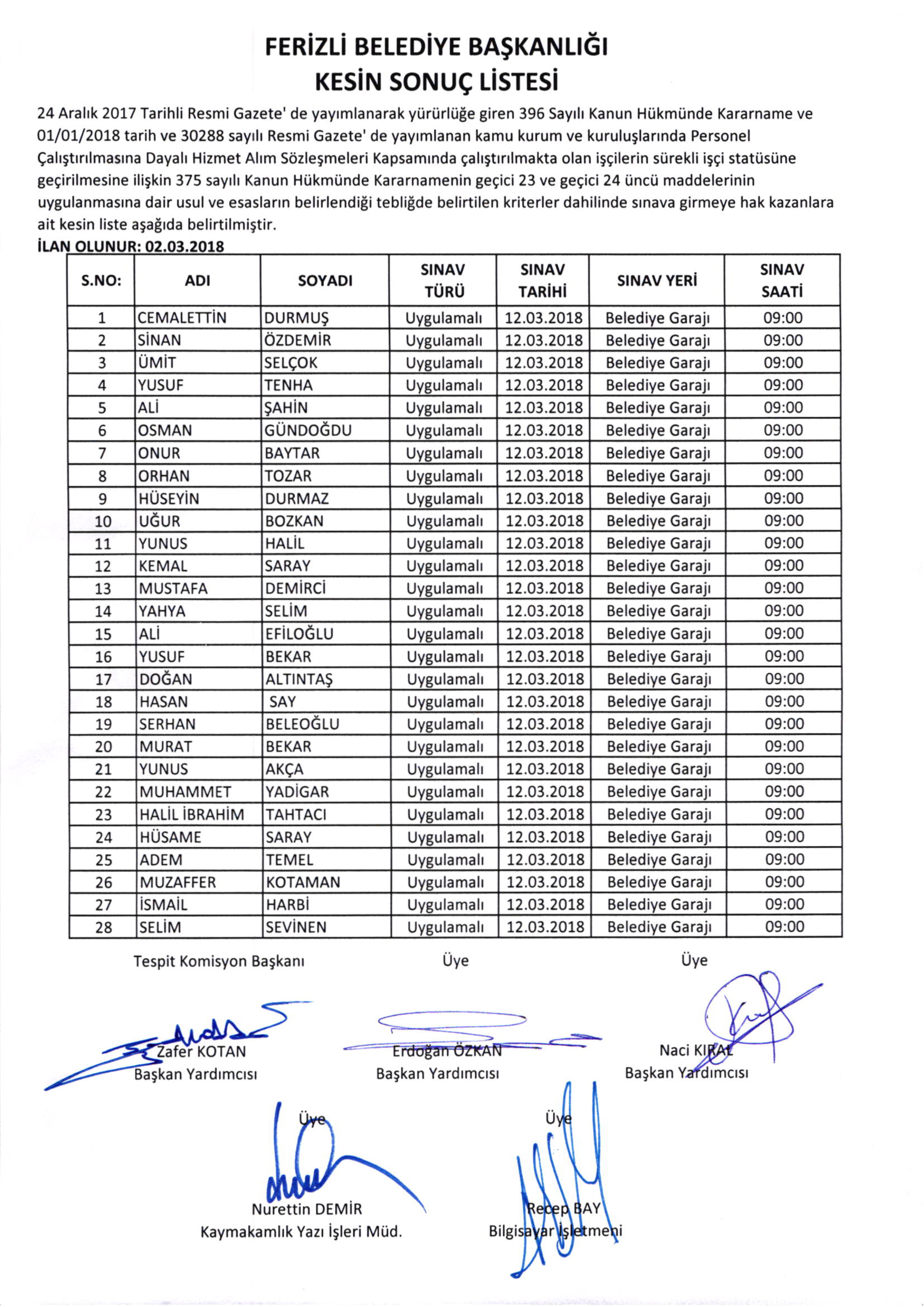 24 Aralık. 2017 Tarihli Resmi Gazete' de yayımlanarak yürürlüğe giren 396 Sayılı Kanun Hükmünde Kararname ve 01/01/2018 tarih ve 30288 sayılı Resmi Gazete'de yayımlanan kamu kurum ve kuruluşlarında Personel Çalıştırılmasına Dayalı Hizmet Alım Sözleşmeleri Kapsamında çalıştırılmakta olan işçilerin sürekli işçi statüsüne geçirilmesine ilişkin 375 sayılı Kanun Hükmünde Kararnamenin geçici 23 Ve geçici 24 üncü maddelerinin uygulanmasına dair usul ve esasların belirlendiği tebliğde belirtilen kriterler dahilinde sınava girmeye hak kazanlara ait kesin liste aşağıda belirtilmiştir.