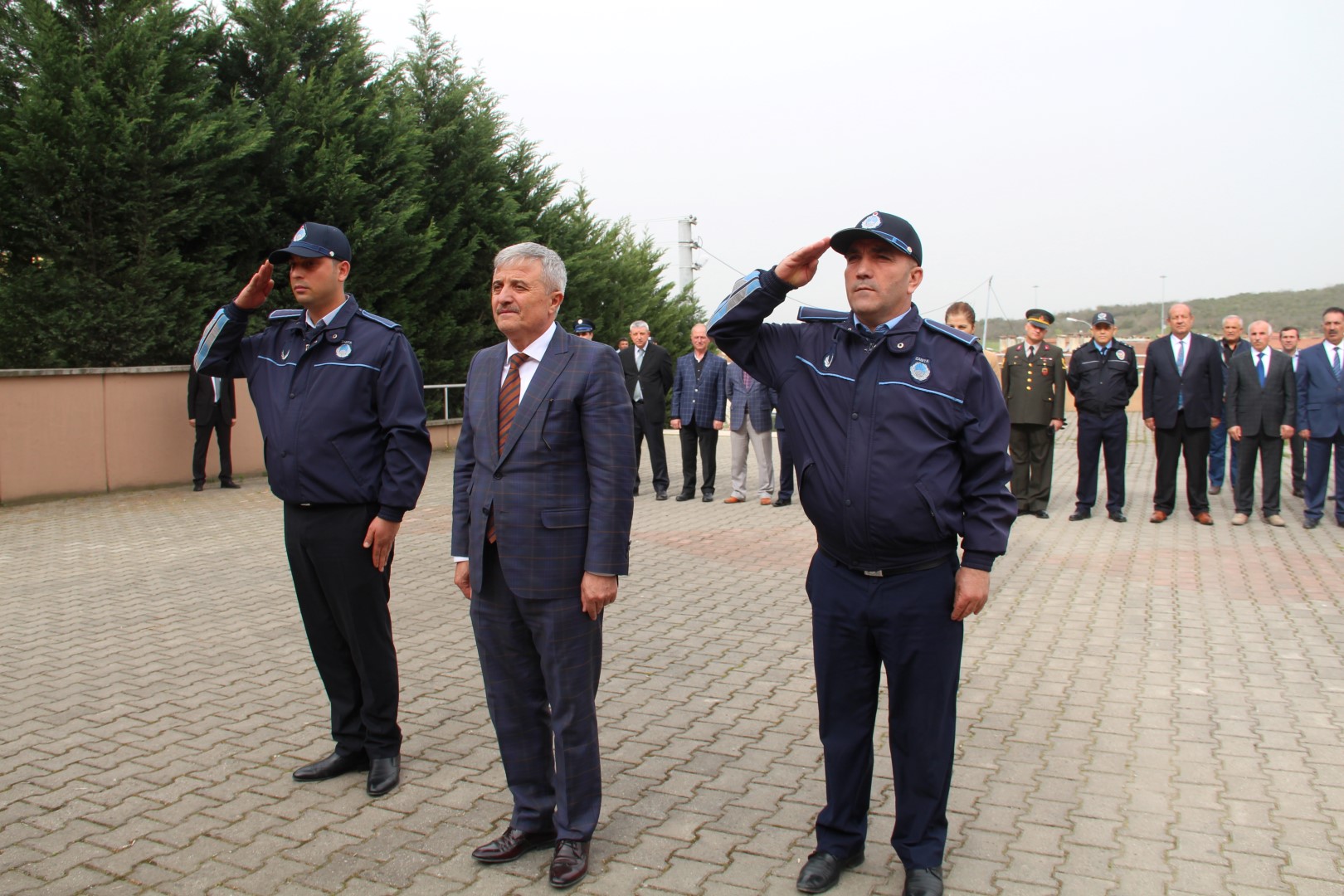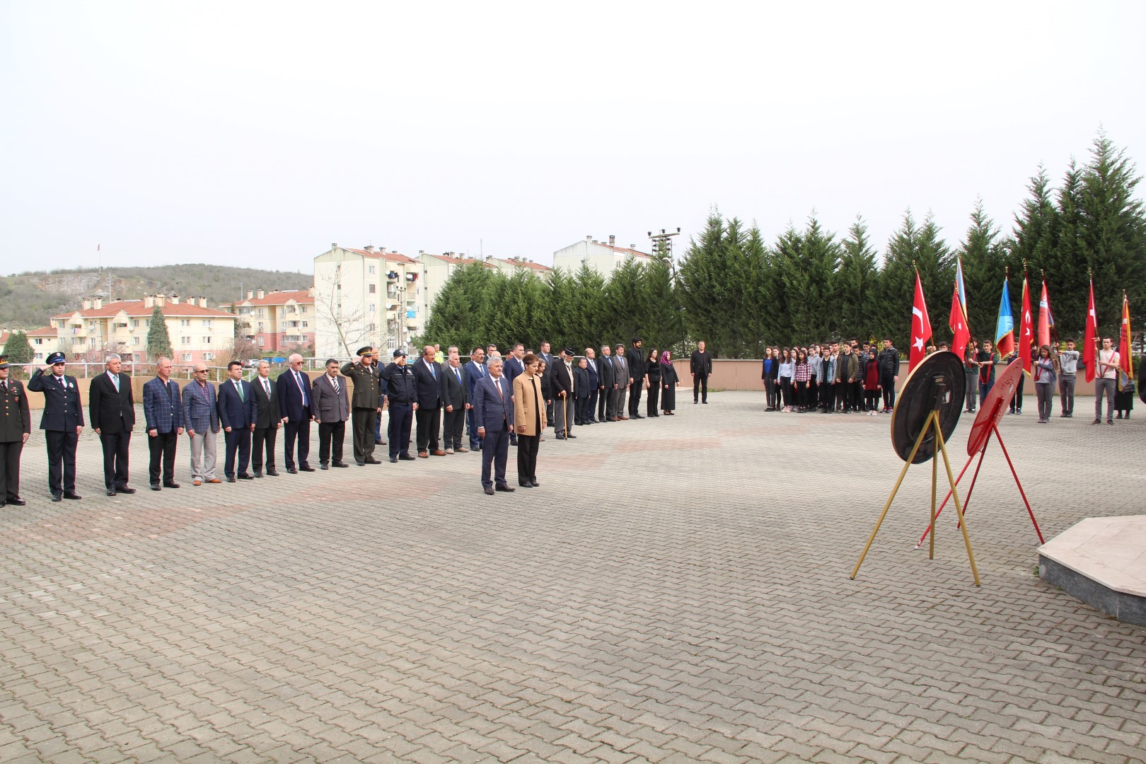 Çelenklerin sunumunun ardından tören, Büyük Önder Mustafa Kemal Atatürk ve Aziz Şehitlerimiz için saygı duruşunda bulunulması ve İstiklal Marşı'nın okunması ile devam etti. Şehit Hakan Bayram Anadolu İmam Hatip Lisesi Tarih Öğretmeni Engin Sinan günün anlam ve önemini belirten güzel bir konuşma yaptı.