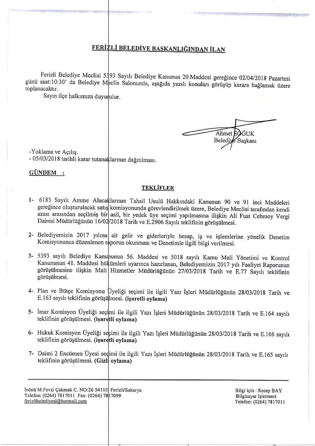 Ferizli Belediyesi Nisan Ayı Meclis Gündemi (02 Nisan 2018 Pazartesi)