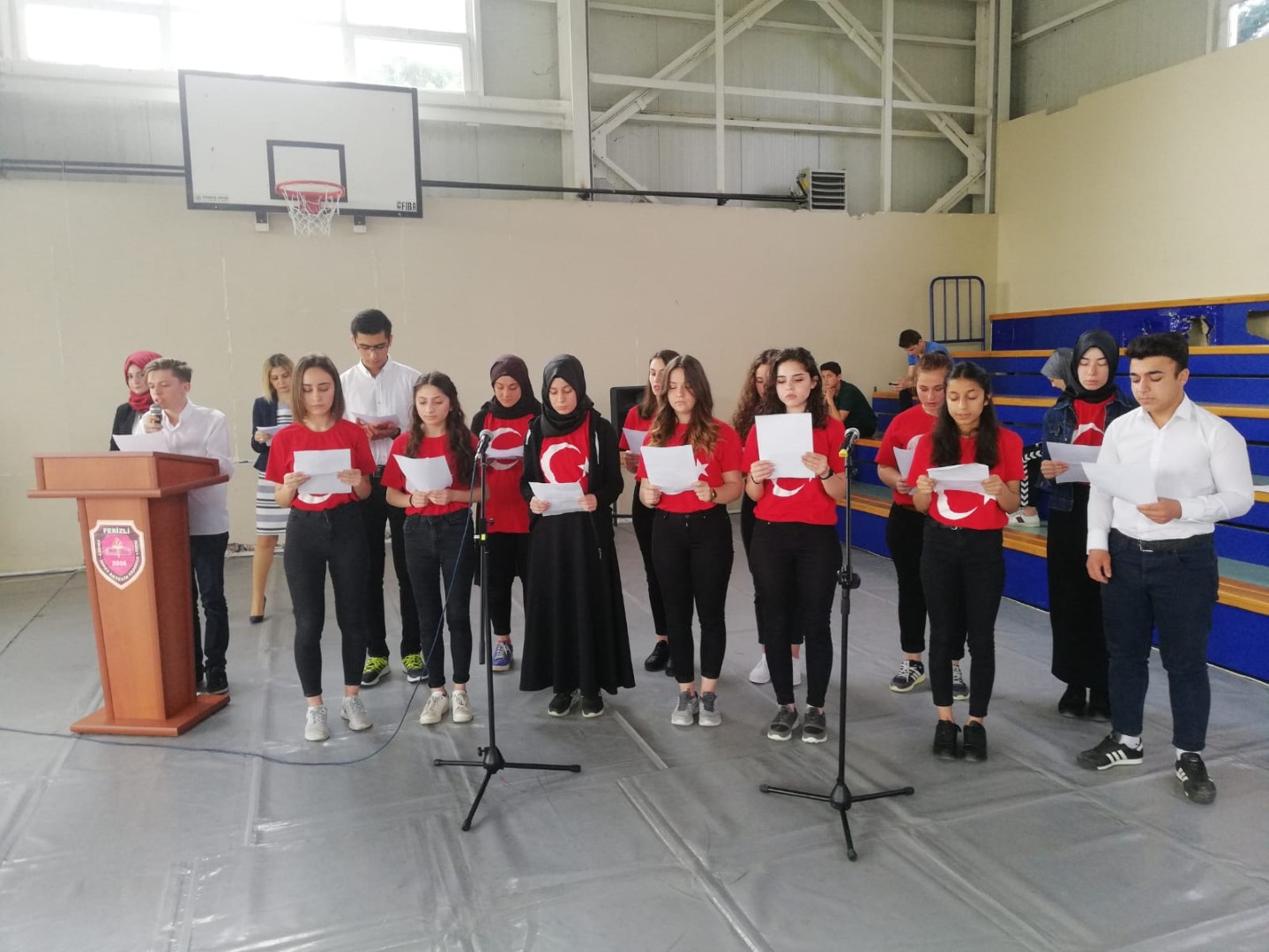 Ardından saygı duruşu ve istiklal marşıyla program devam etti. Şehit Hakan Bayram Anadolu İmam Hatip Lisesi Beden Eğitimi Öğretmeni Oğuz Özkan, günün anlam ve önemini belirten güzel bir konuşma yaptı. Kutlamalar öğrencilerin okuduğu şiirler, oratoryo gösterileri ve çeşitli spor dalların da sergiledikleri gösterilerin ardından sona erdi.