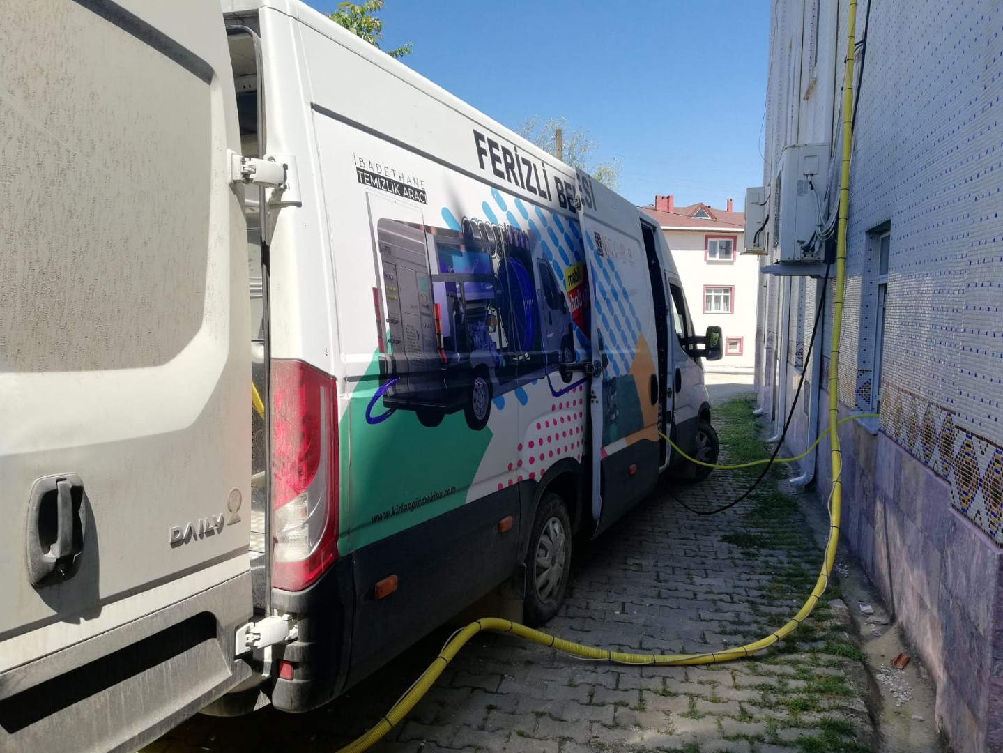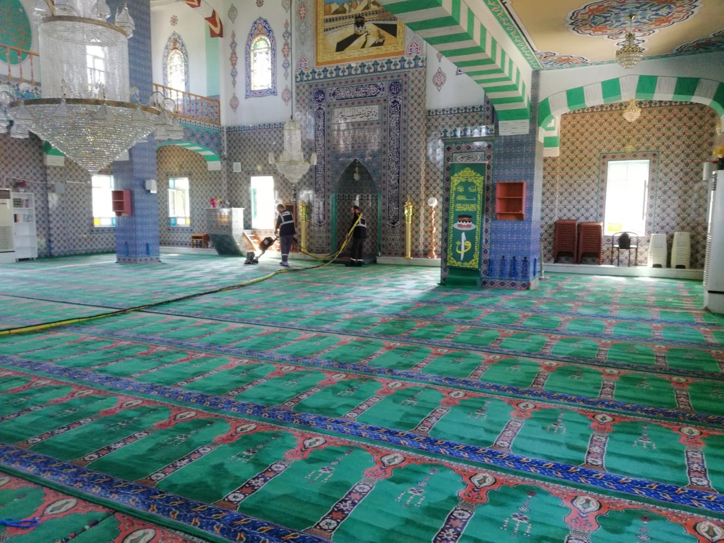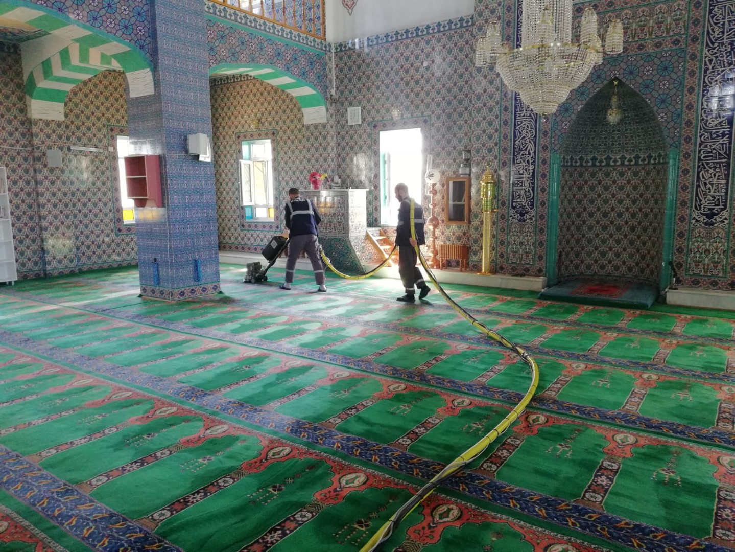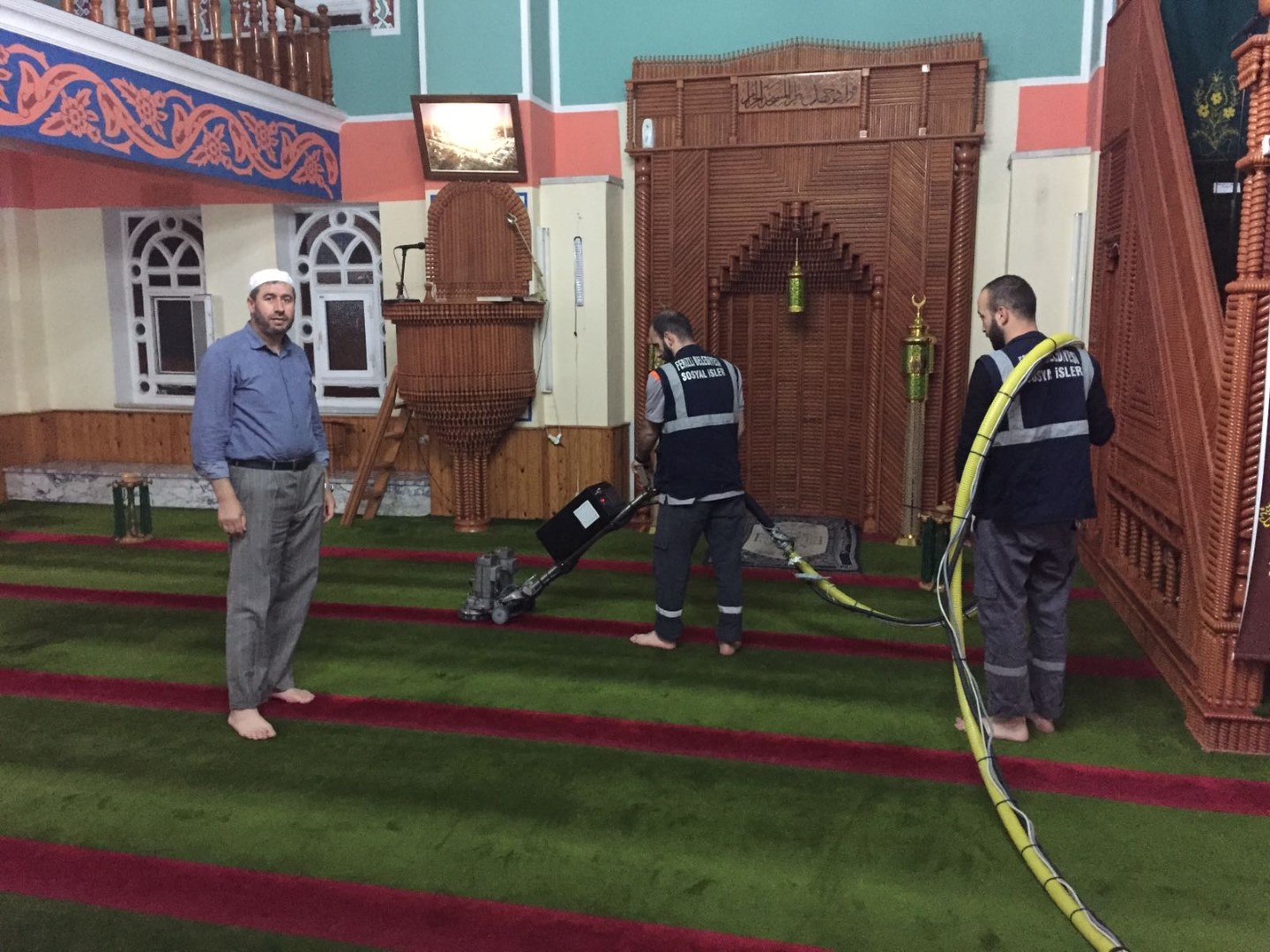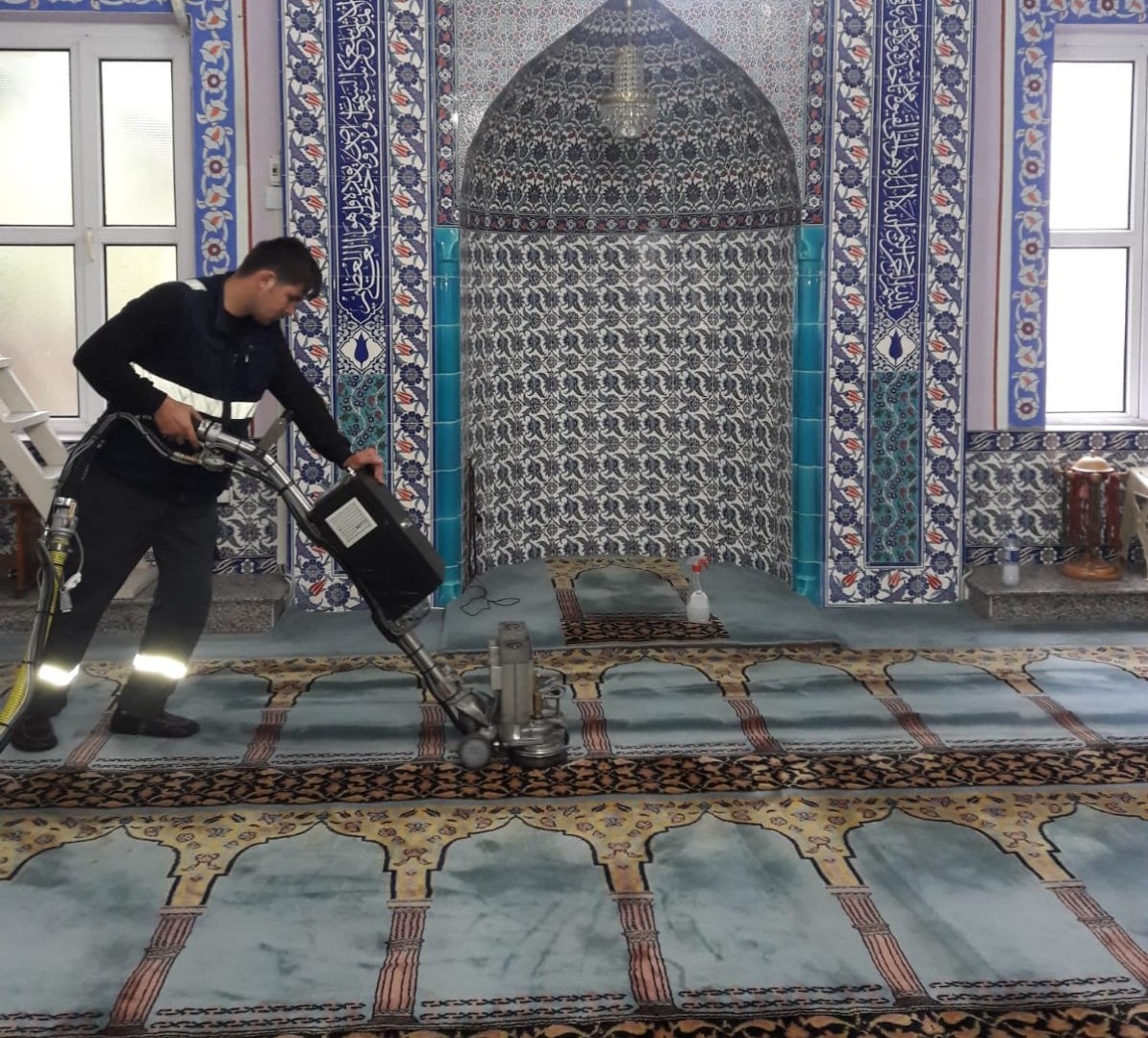 Önce camilerin halılarını özel makineler ile yıkayan temizlik ekibi; ardından da mihrap, minber, vaaz kürsüsü, kütüphane, müezzin mahfili gibi kısımları temizlediler.