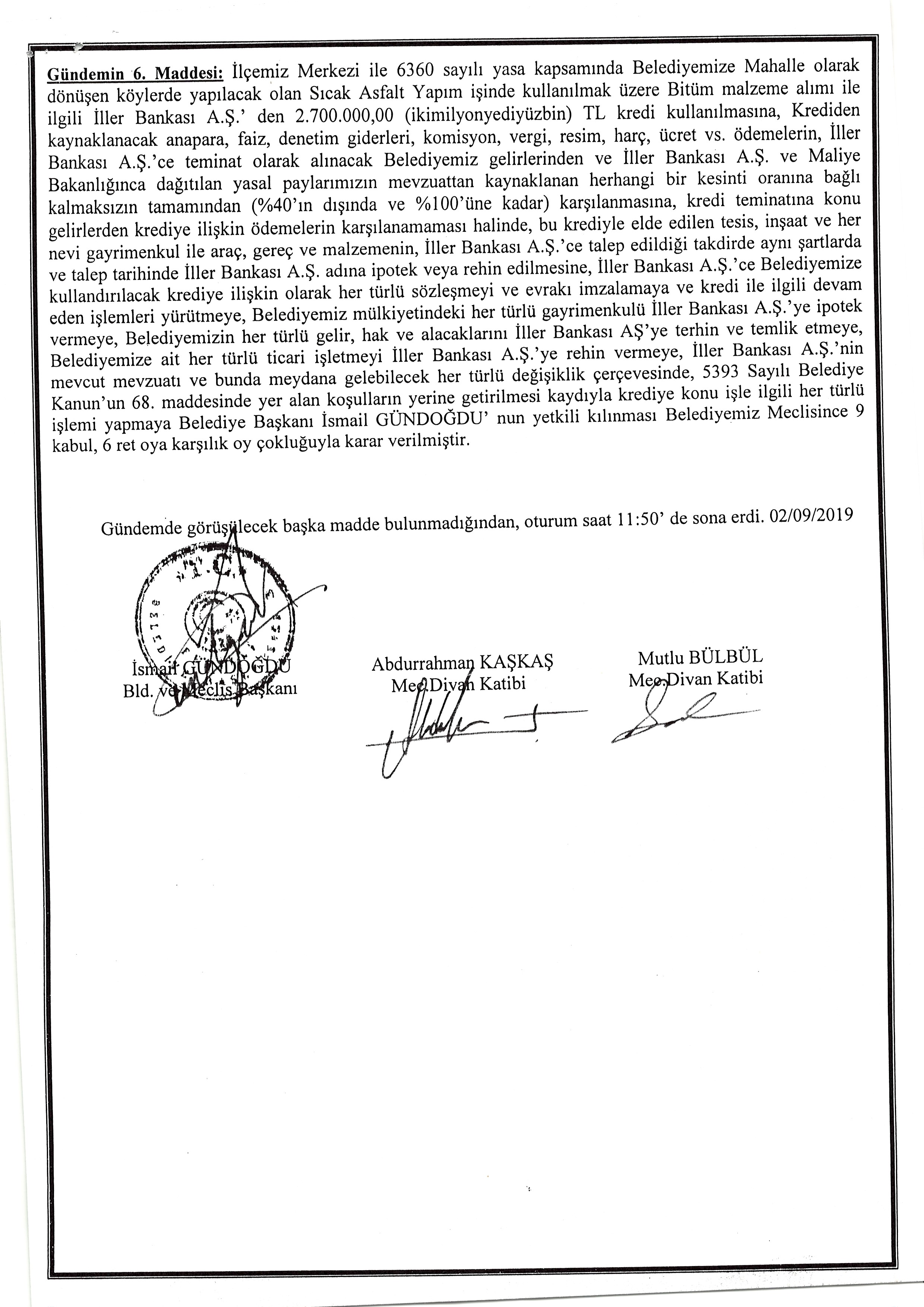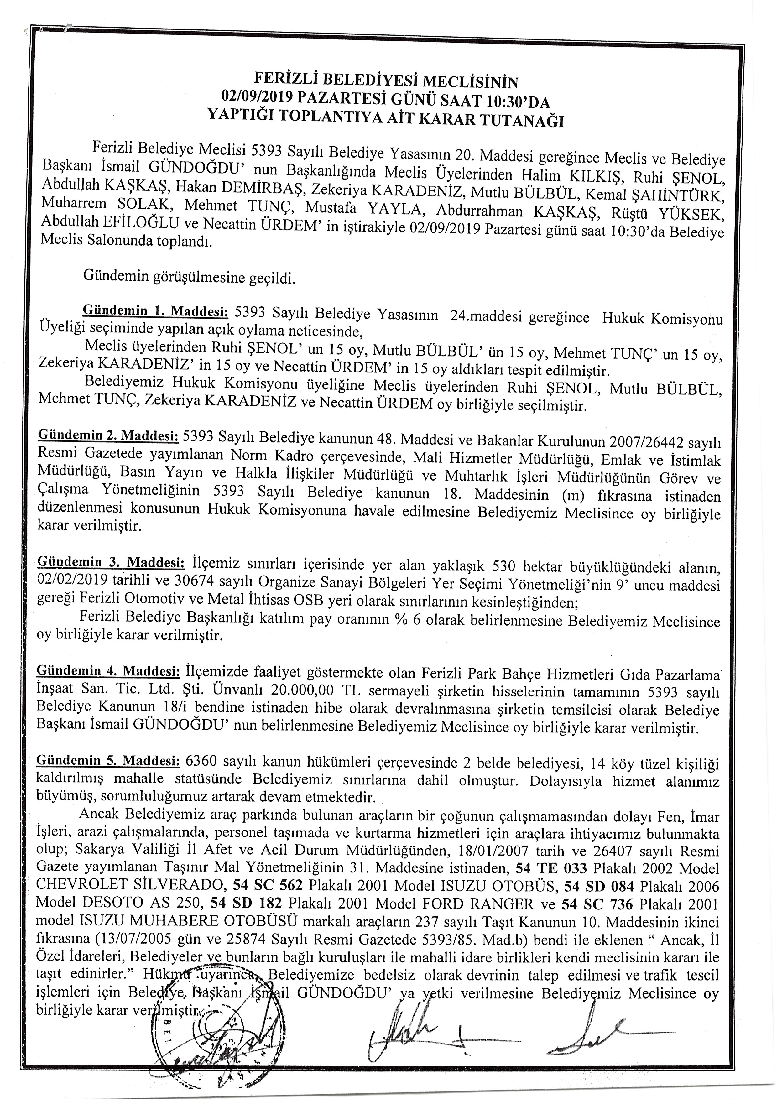 Ferizli Belediyesi Eylül Ayı Meclis Karar Özeti (02.09.2019 Pazartesi)