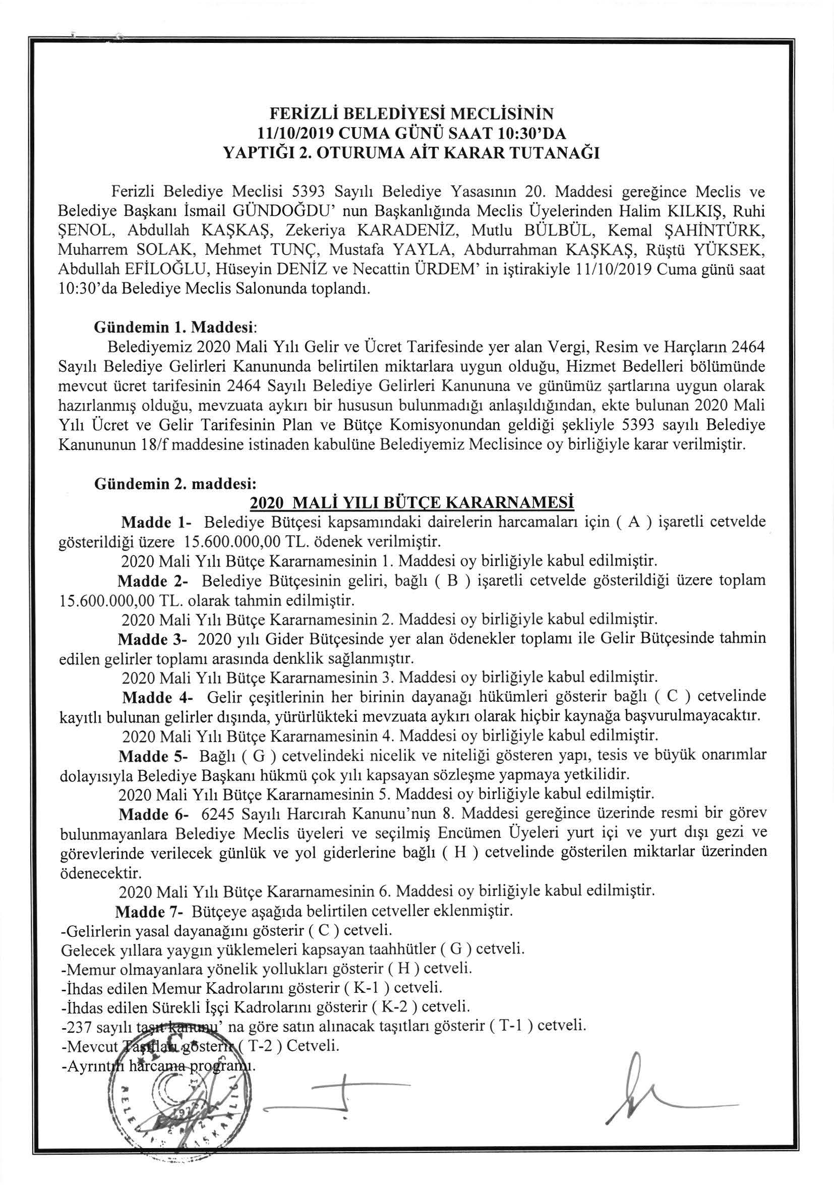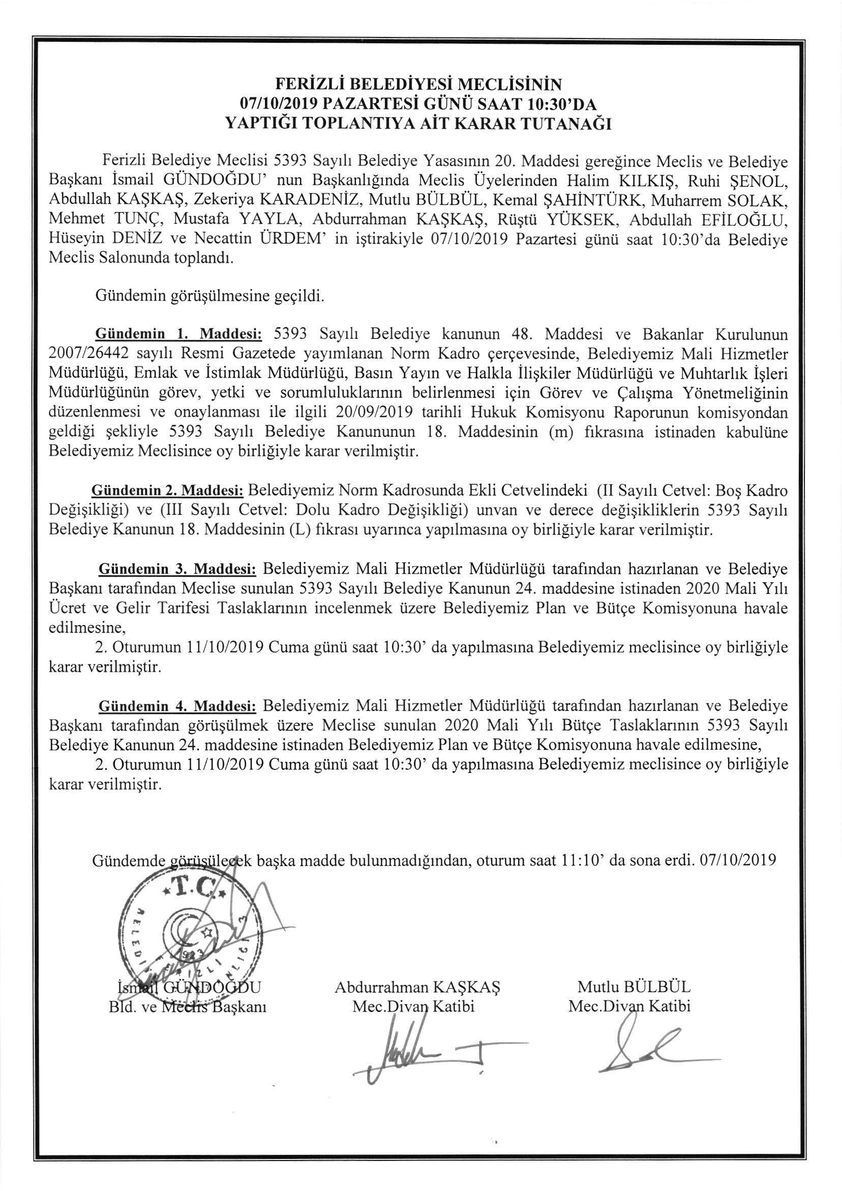 Ferizli Belediyesi Ekim Ayı Meclis Karar Özeti (07.10.2019 Pazartesi)