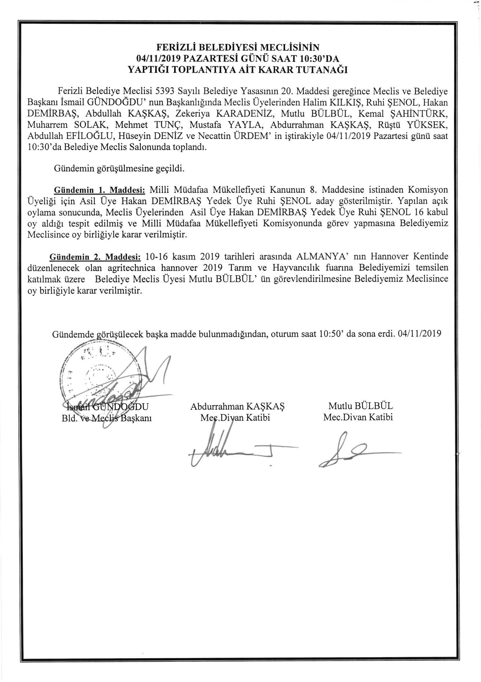 Ferizli Belediyesi Kasım Ayı Karar Özeti (04.11.2019 Pazartesi)