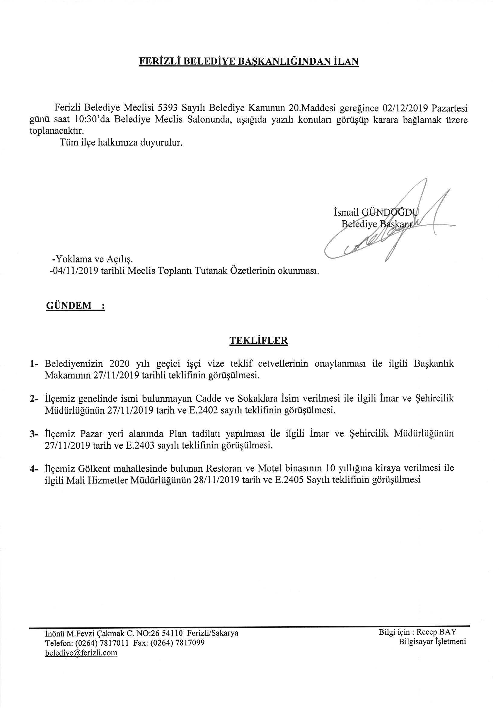 Ferizli Belediyesi Aralık Ayı Meclis Gündemi (02.12.2019 Pazartesi)