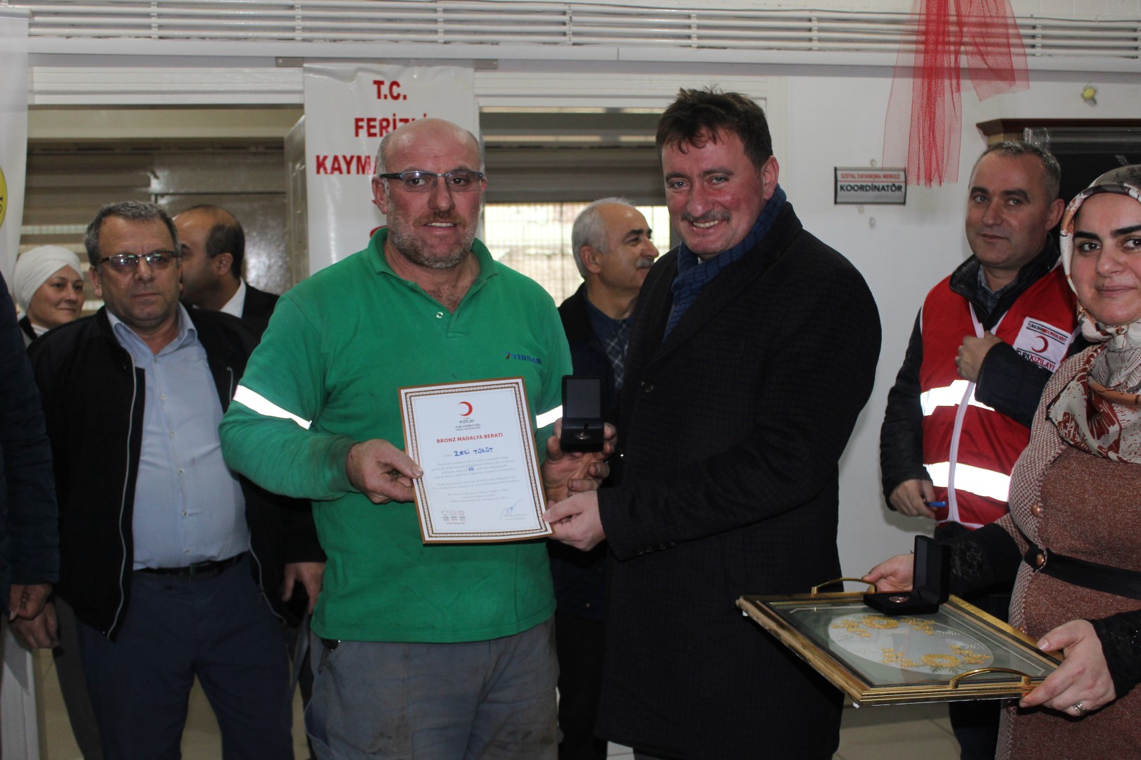 Kızılay’ın kan bağışı kampanyasına sürekli katılım göstererek kan bağışında bulunan 14 vatandaşa, Kaymakamımız Bahattin Alp Arslanköylü ve Belediye Başkanımız İsmail Gündoğdu tarafından teşekkür belgesi ve ödül takdim edildi.