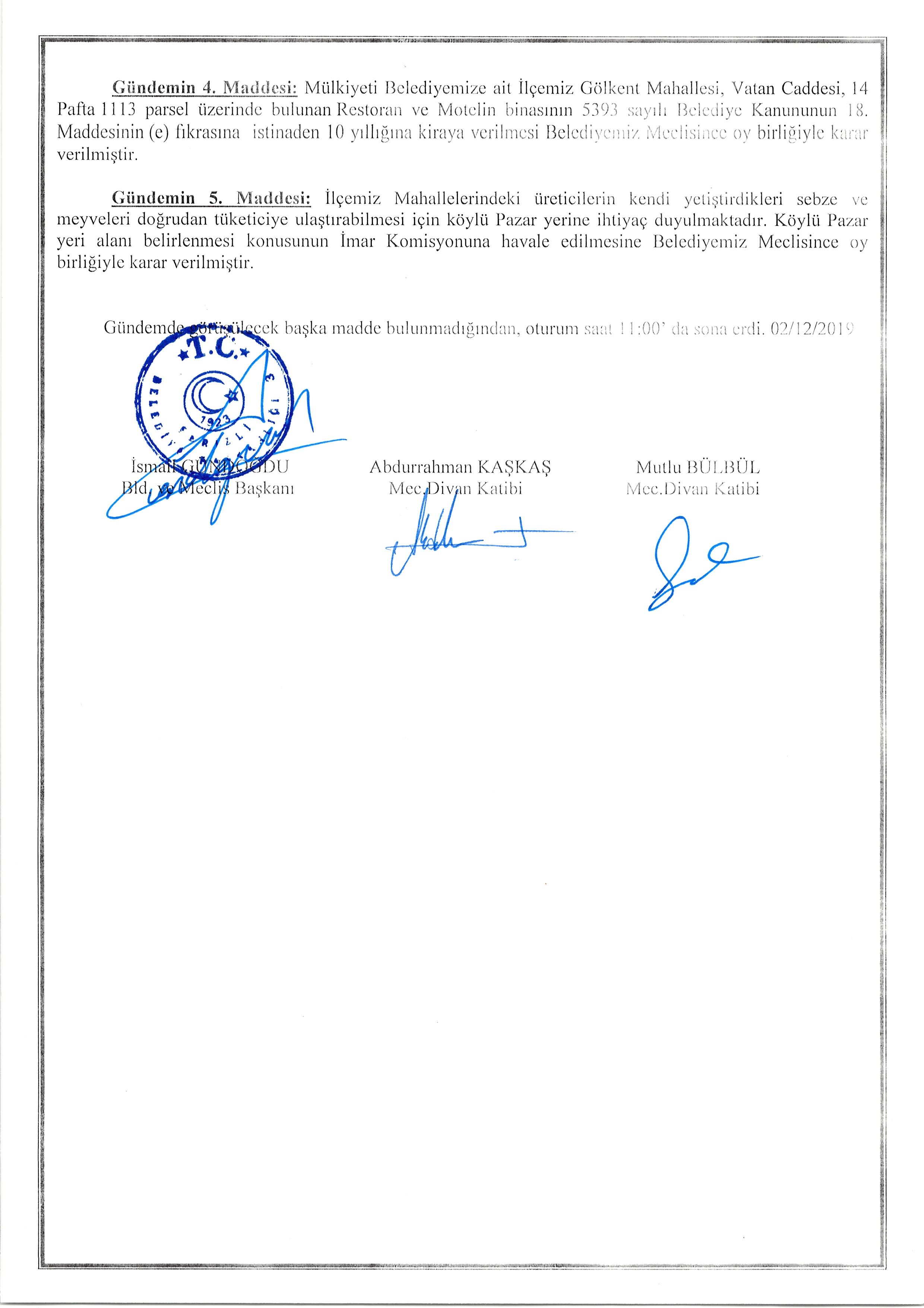 Ferizli Belediyesi Aralık Ayı Meclis Karar Özeti (02.12.2019 Pazartesi)