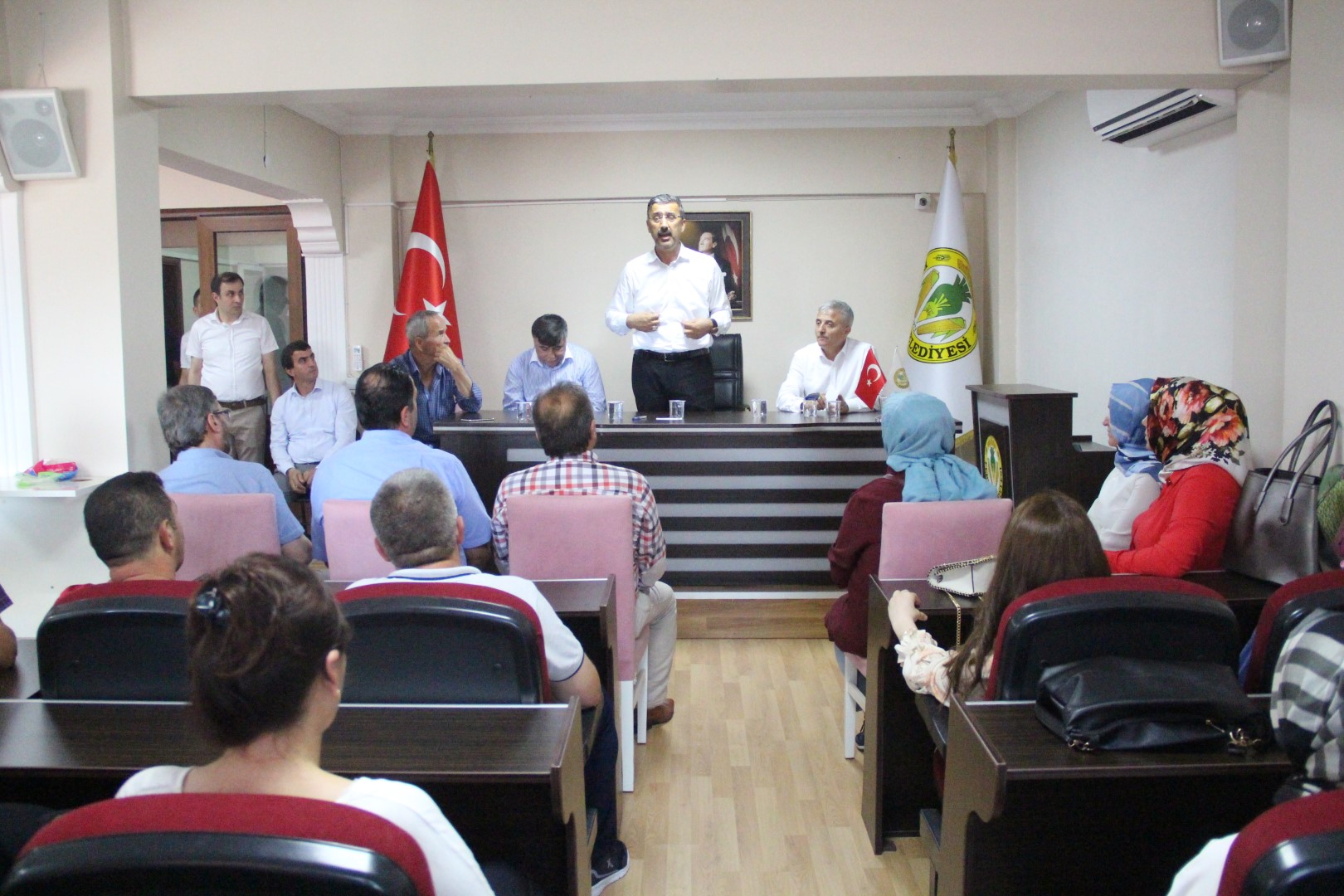 Personel bayramlaşmasında duygulu anlar da yaşandı. Birkaç ay önce vefat eden belediye Personeli Fethi Serhoş’un ruhuna Fatiha okunarak yâd edildi.