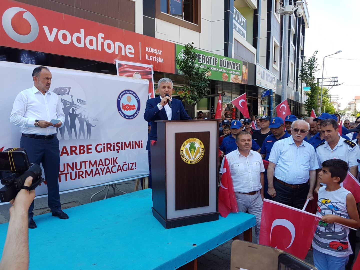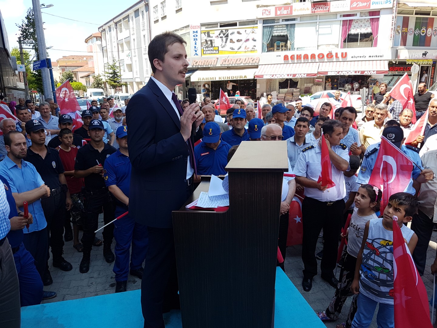 Kaymakam Fatih Kurt ise “15 Temmuz kahraman bir gazetecinin kahraman liderimizin çağrısını canlı yayınlayarak başlayan bir destandır. Bir takım çapulcuların dış güçler vasıtasıyla başlattığı isyanı halkımız bu çağrı ile duymuş ve meydanlara yürüyerek iman dolu göğsünü tanklara siper etmiştir. 15 Temmuz şüphesiz ki bir zafer gecesidir. Vatan sahipsiz değildir. Türkiye Cumhuriyeti elbet bir gün tüm dünyanın karşısında saygıyla ve korkuyla eğildiği bir devlet haline gelecektir. Bizim altında toplanacağımız başka bir bayrağımız yoktur. Şehitlerimizin hepsi ayrım gözetmeksizin bizim için eşittir. Her biri bizim için mukaddes ve muhteşem bir vatan savunmasının elleri öpülesi evlatlarıdır. Mehmetler bizimdir, bizler Mehmet’iz. Ve bu vatan onlara emanettir. 15 Temmuz demokrasi ve milli birlik gününüzü şimdiden tebrik ediyorum. Allah milletimize bir daha böyle bir gece yaşatmasın. Şehitlerimize rahmet, gazilerimize şifa diliyorum” dedi.