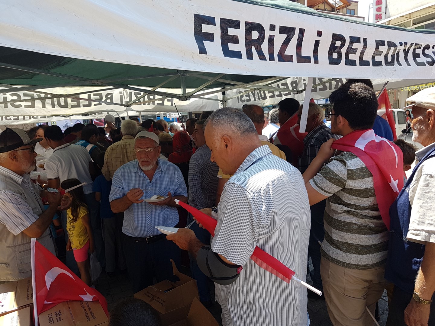 Cuma Namazı çıkışında Ferizli Belediyesi tarafından vatandaşlara Türk Bayrağı dağıtıldı ve 15 Temmuz Şehitleri anısına lokum ikram edildi. Ellerine Türk Bayrağını alan vatandaşlar Ferizli Belediyesi’nin önünde toplandılar. Polis ve Jandarma eşliğinde 15 Temmuz Demokrasi meydanına yürüdüler.