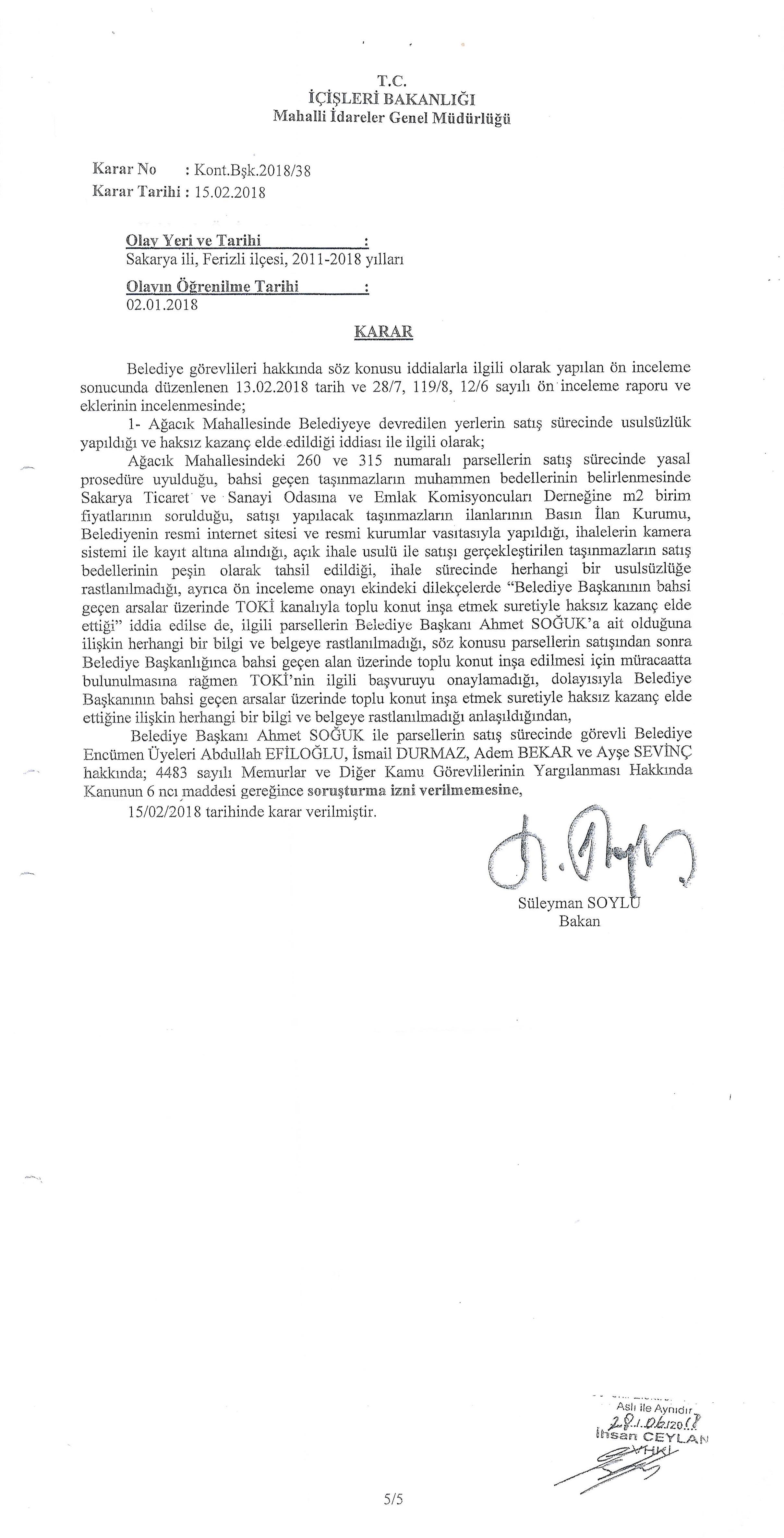 İşte bu rapor, “Hem Ağacık’ta ki parsel ihalesinde, hem de satışlarda belediyenin bir usulsüzlüğünün olmadığını belgeleriyle ortaya döktü.” Kısacası konuyla ilgili iddiaların asılsız olduğu ve belediyenin usulsüz iş yapmadığı İç İşleri Bakanlığınca belgelendi.