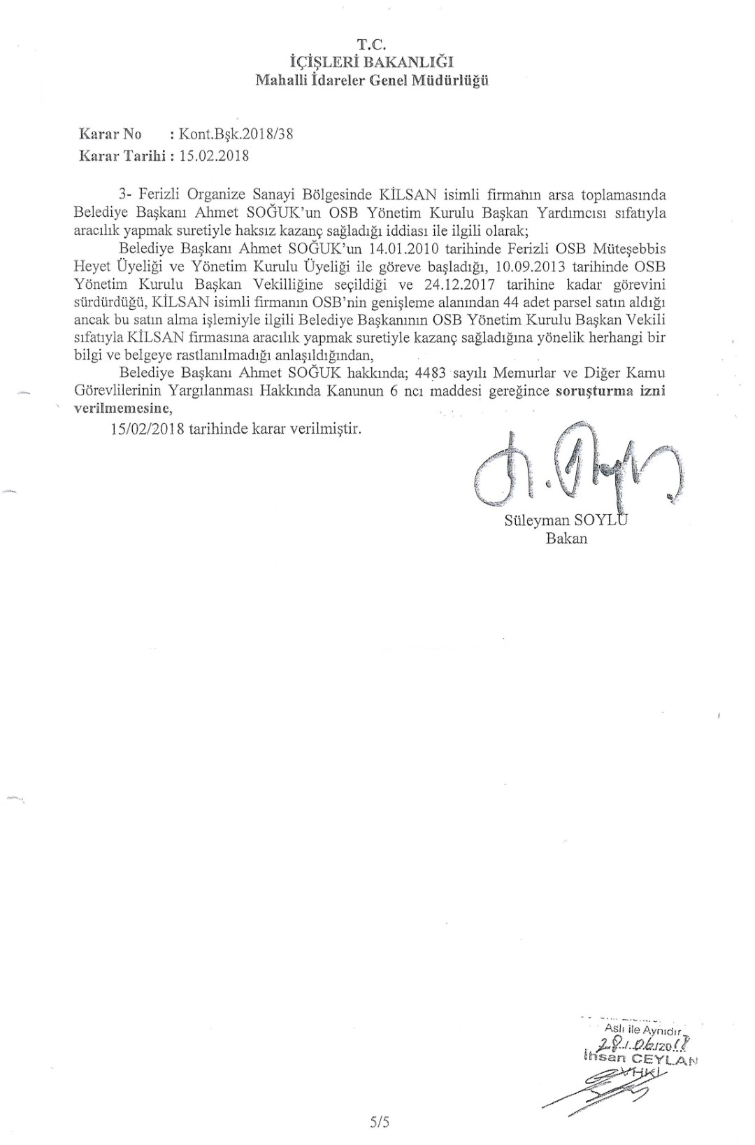 Başkan hakkında ortaya atılan iddialardan biride Ferizli Organize Sanayi Bölgesine yatırım yapmak isteyen KİLSAN isimli firma ile Başkanın temas kurduğu ve Ferizli OSB’de ki kıdemini de kullanarak KİLSAN firmasına teminat verip genişleme bölgesi içinde arsa toplattığı yönündeydi.