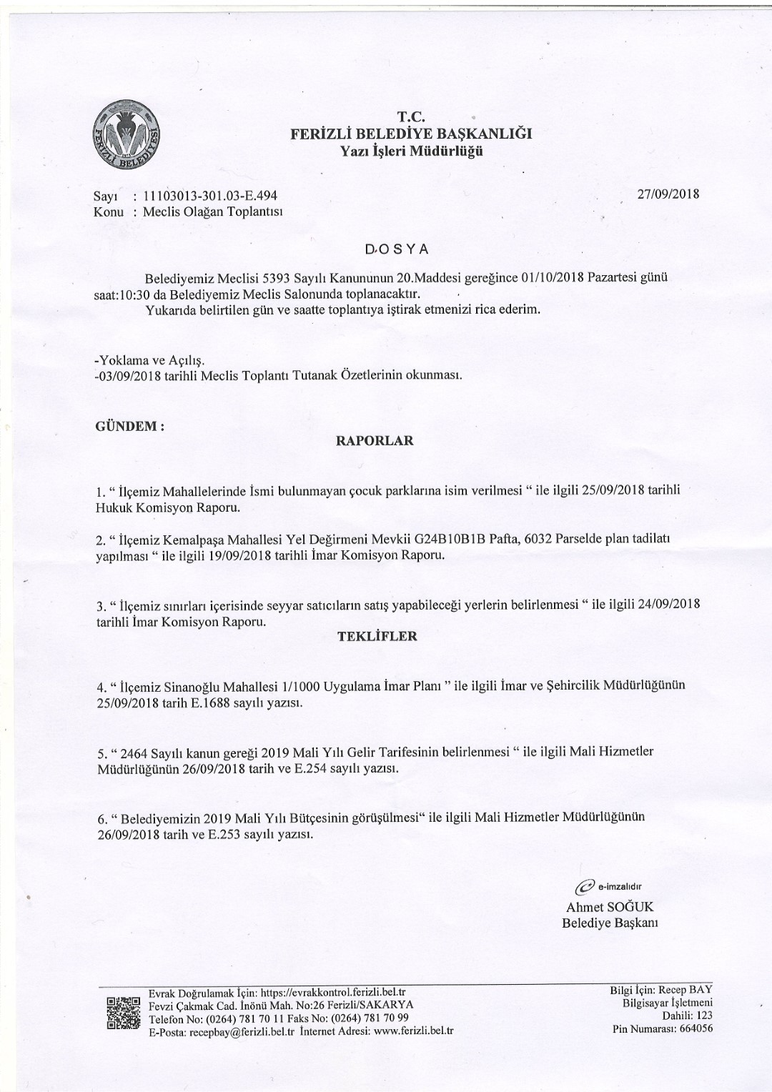 Ferizli Belediyesi Ekim Ayı Meclis Gündemi (01 Ekim 2018 Pazartesi)