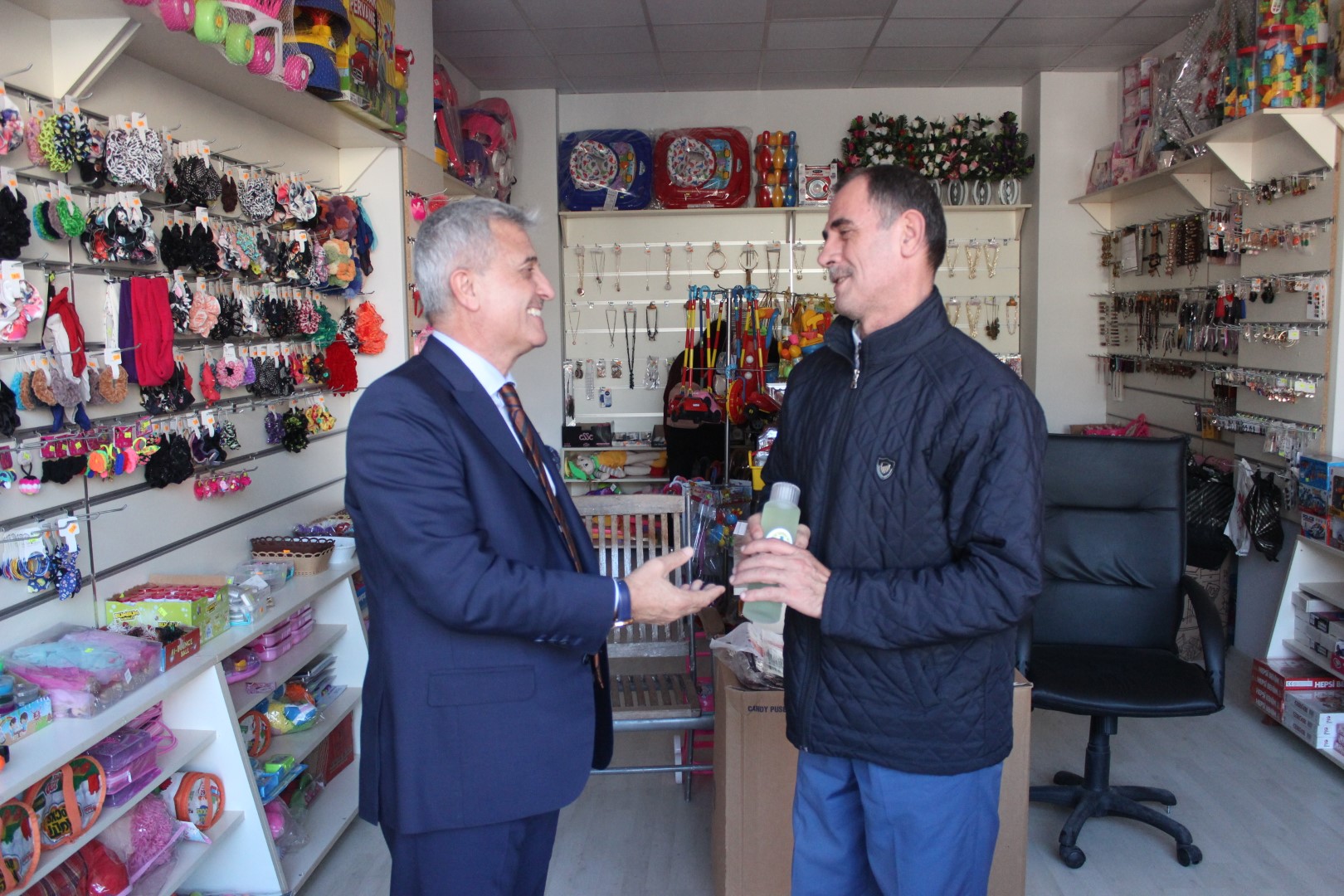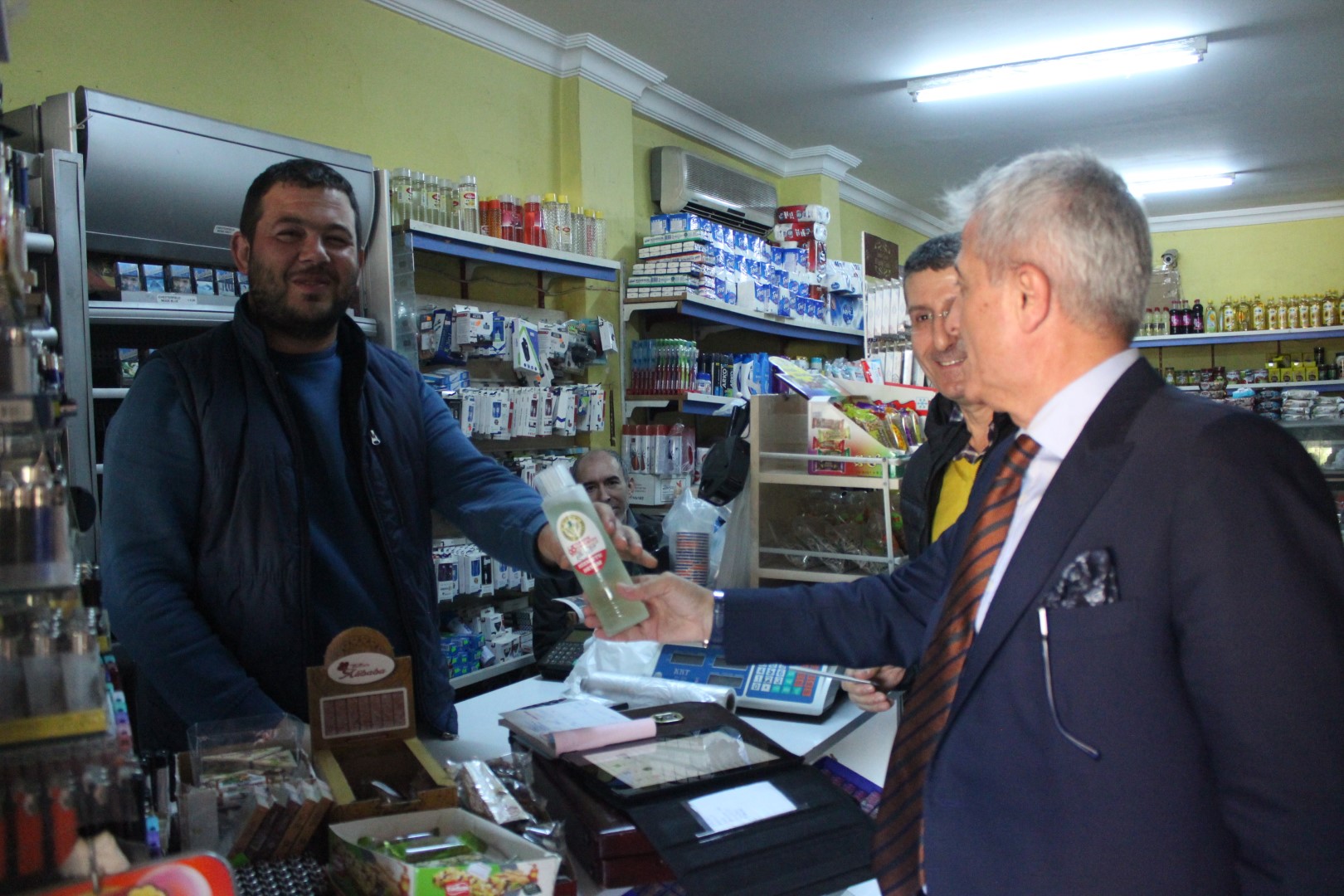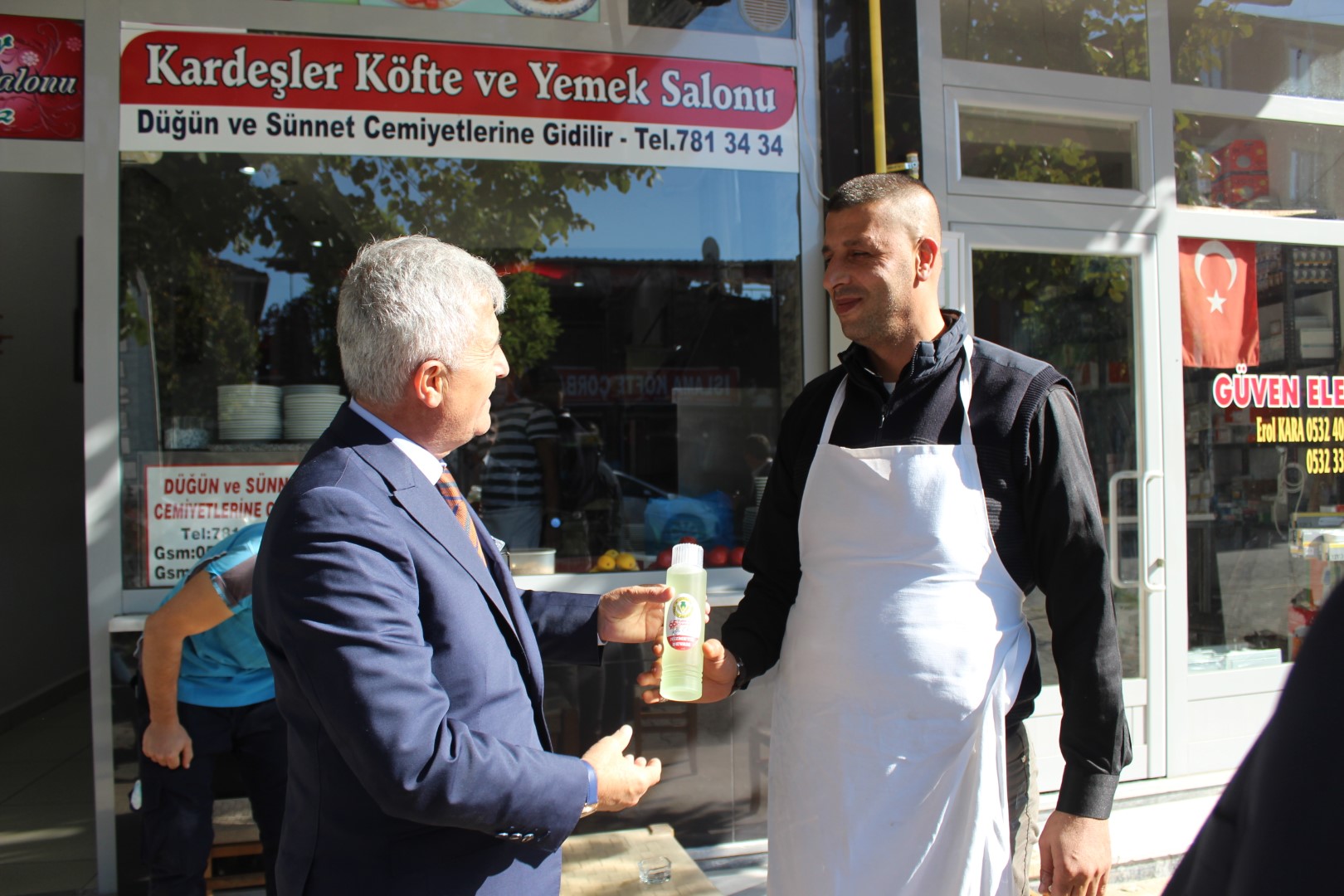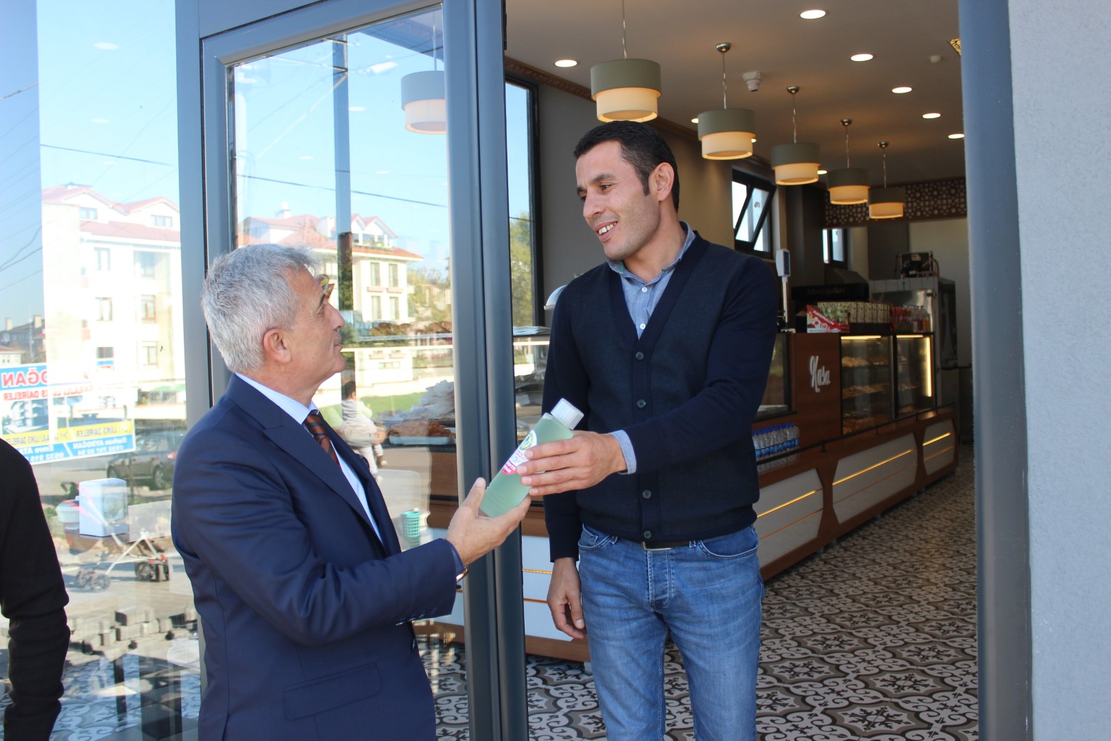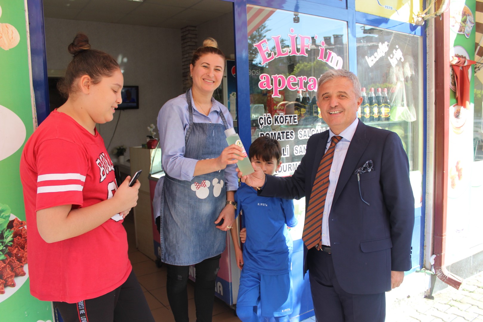 Tüm esnafları tek tek dolaşan Belediye Başkanı Ahmet Soğuk, esnaflara kolonya dağıtarak, Cumhuriyet Bayramı’nı kutladı.