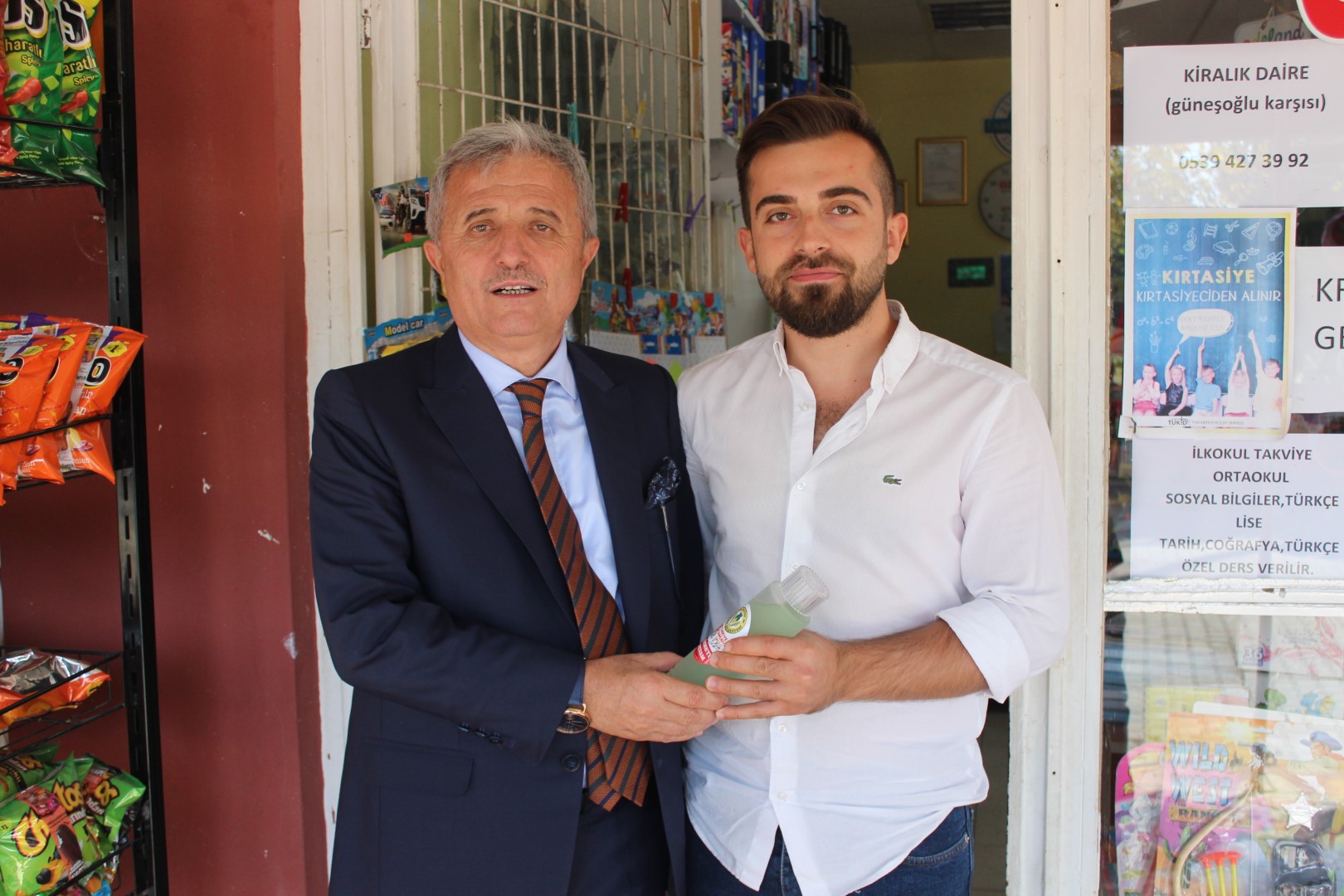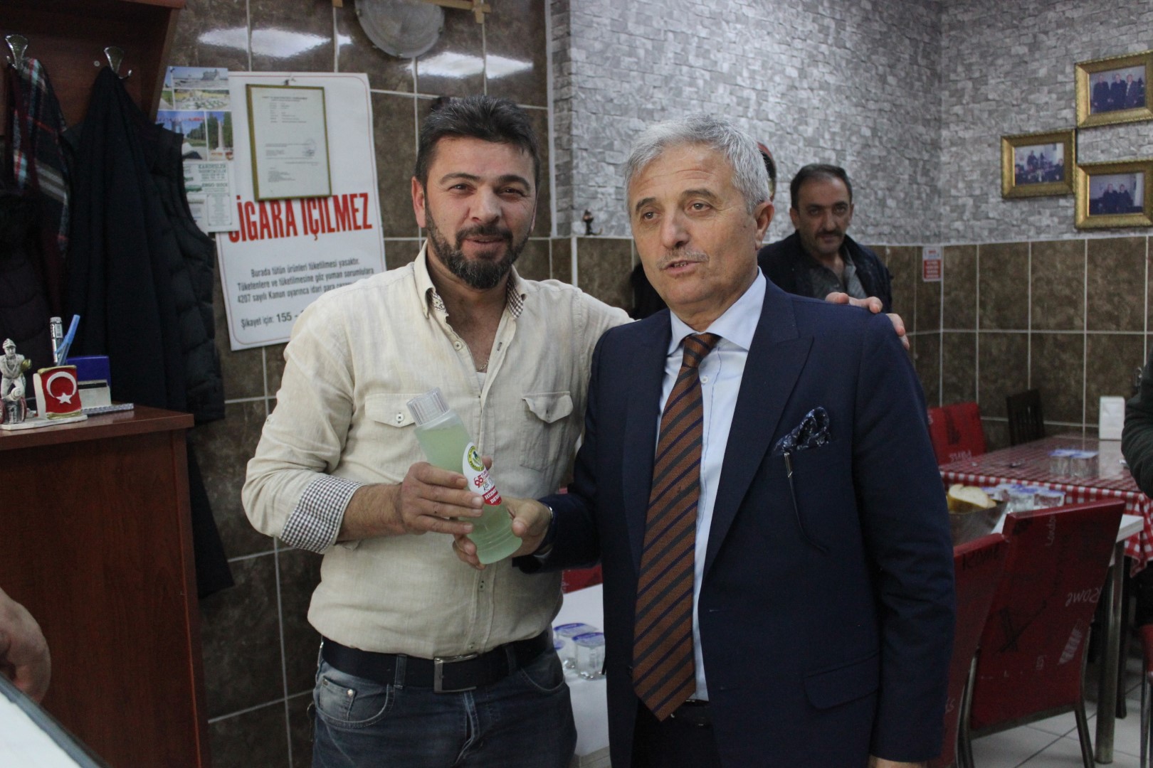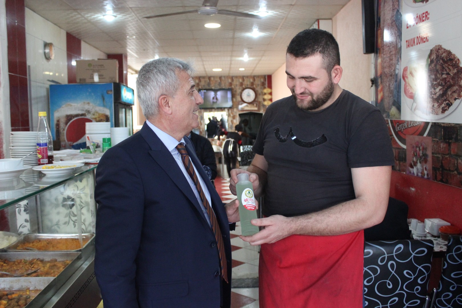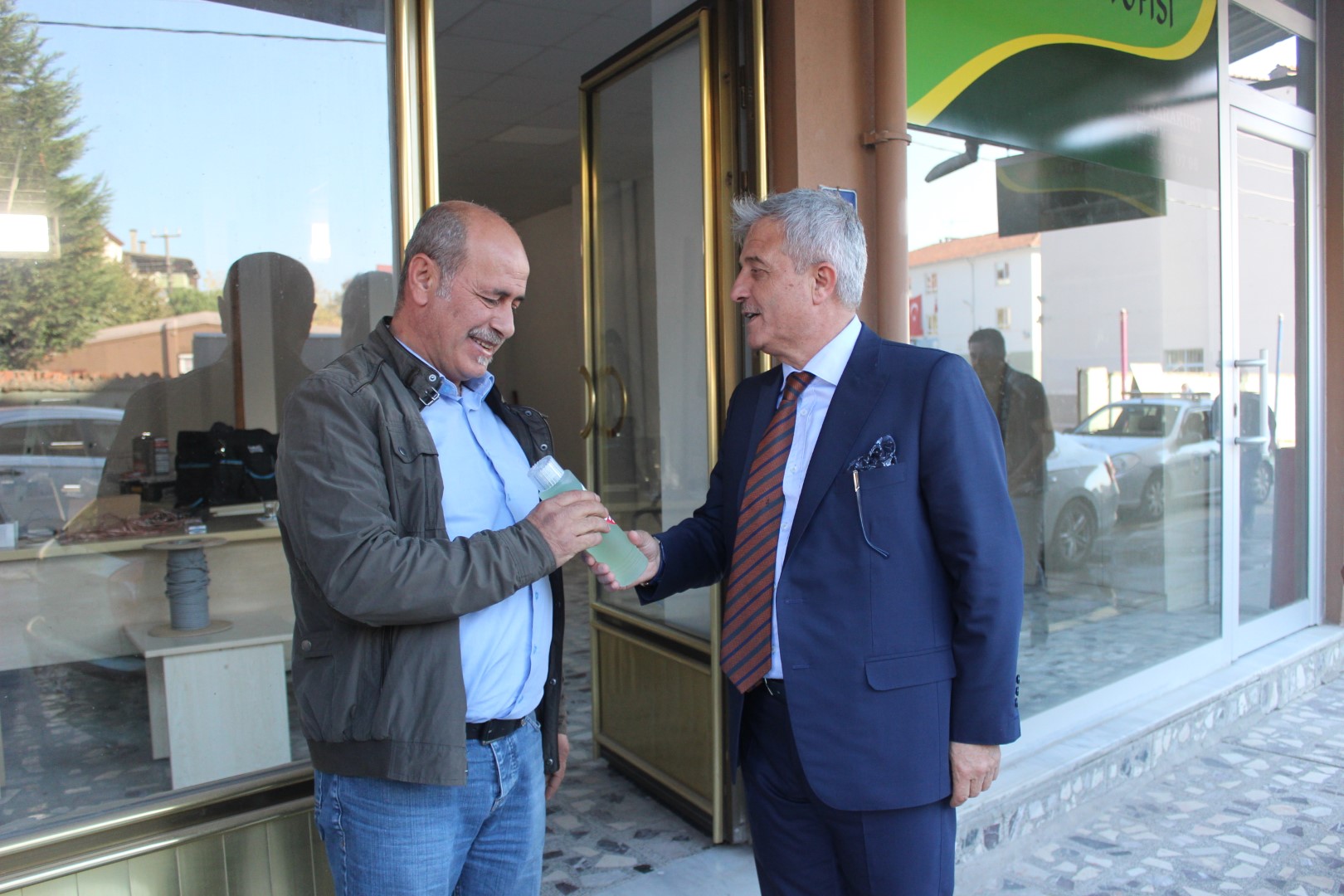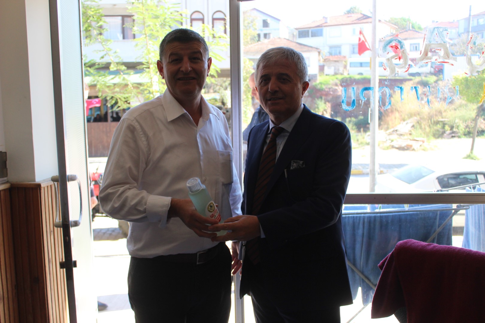 Tüm esnafları tek tek dolaşan Belediye Başkanı Ahmet Soğuk, esnaflara kolonya dağıtarak, Cumhuriyet Bayramı’nı kutladı.