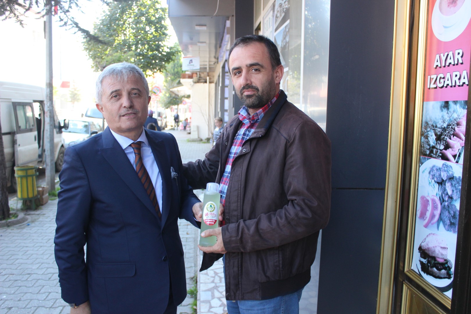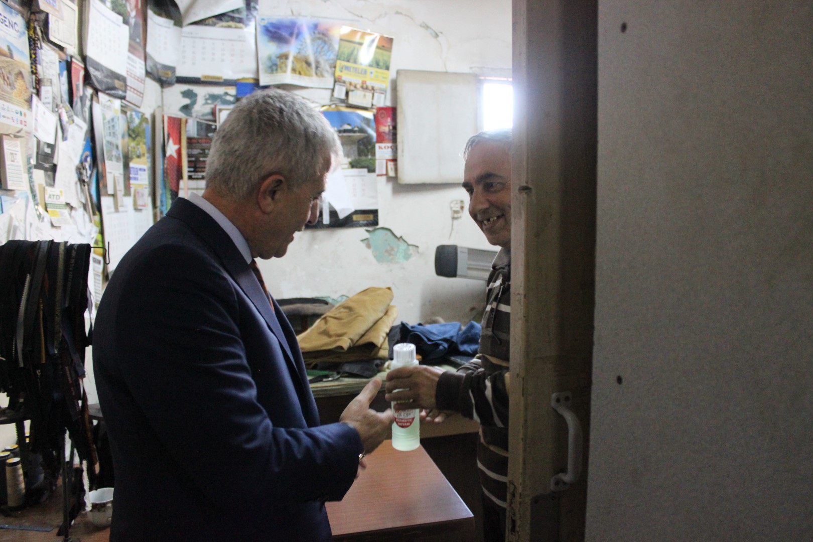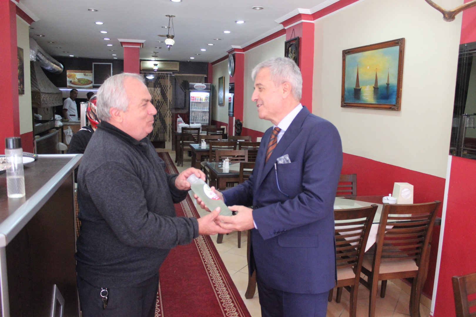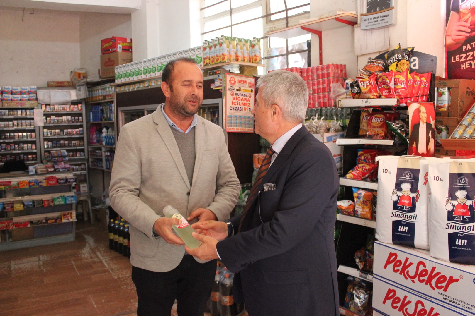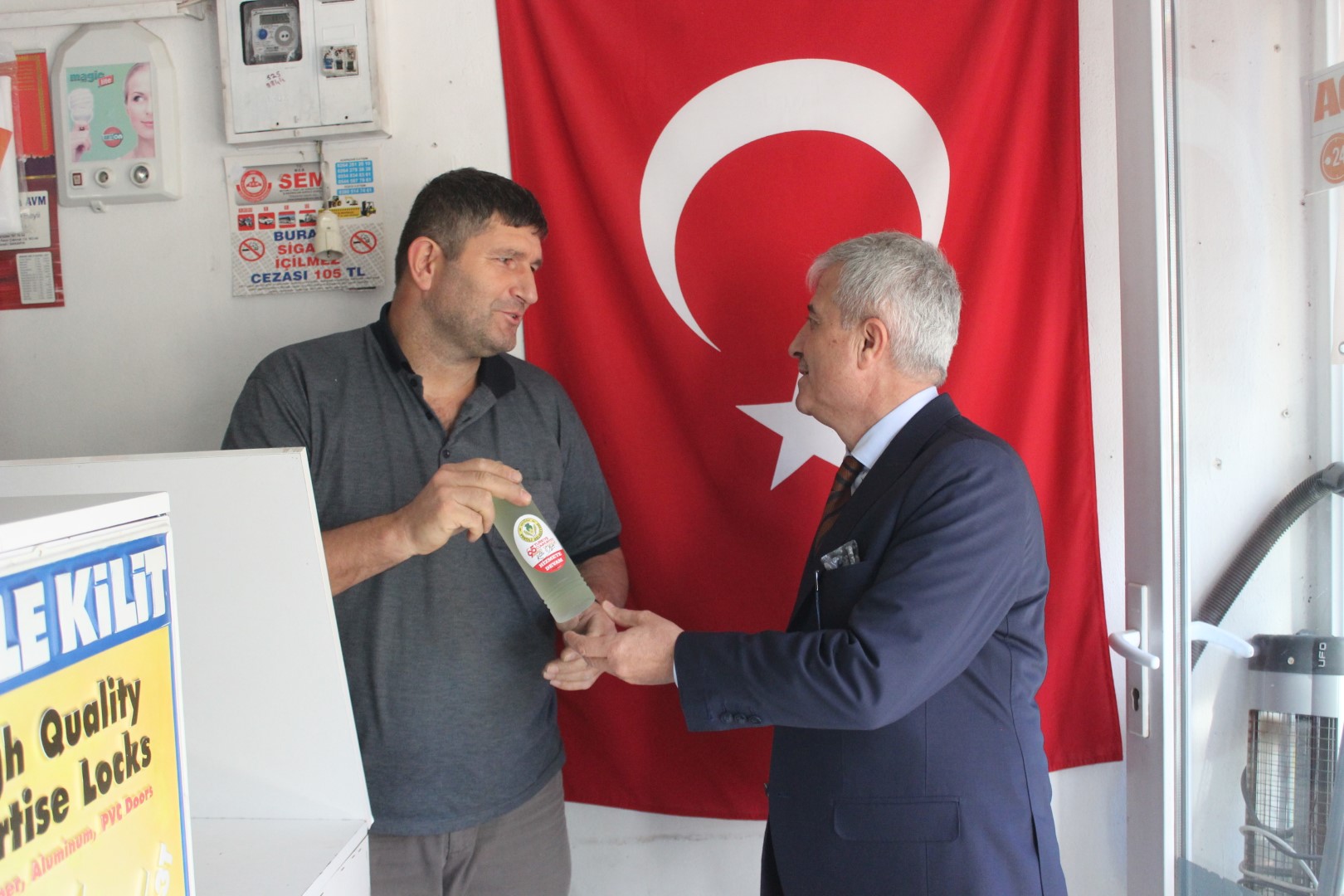 Tüm esnafları tek tek dolaşan Belediye Başkanı Ahmet Soğuk, esnaflara kolonya dağıtarak, Cumhuriyet Bayramı’nı kutladı.