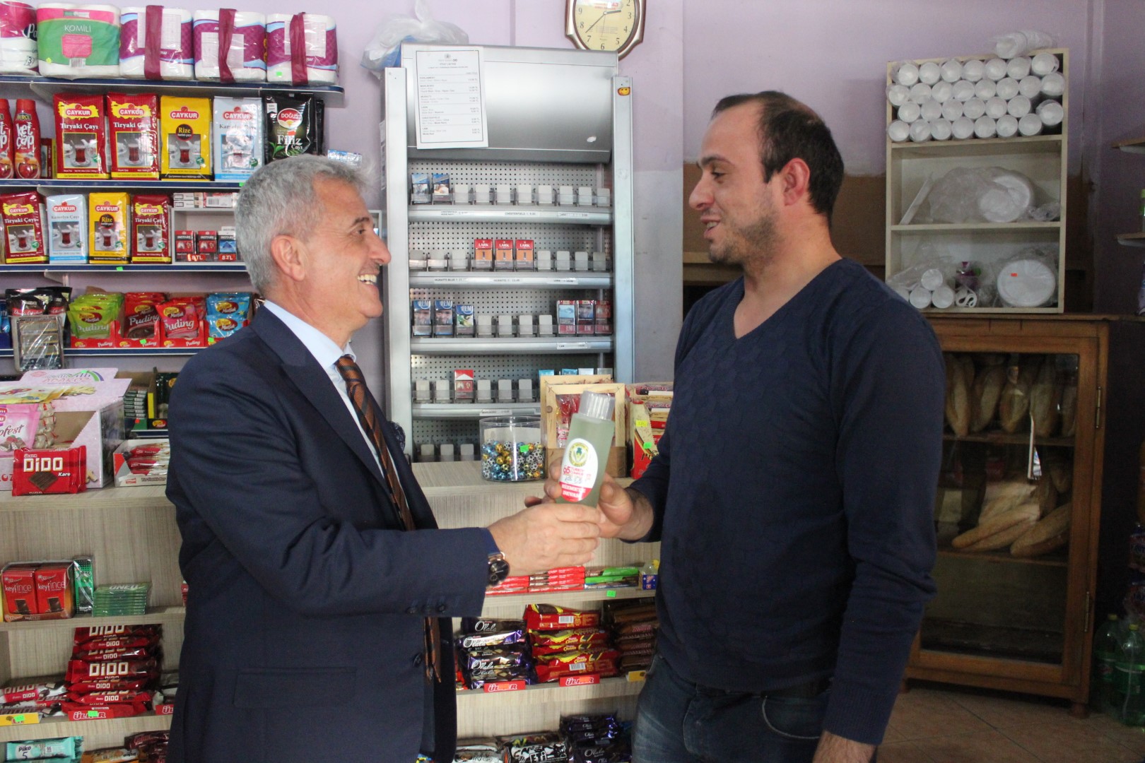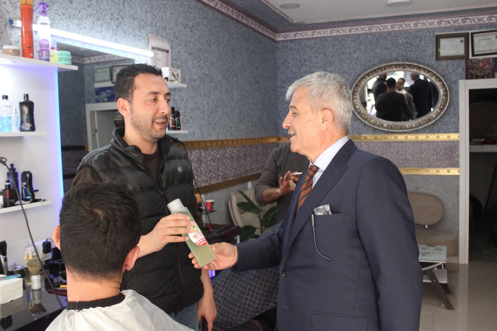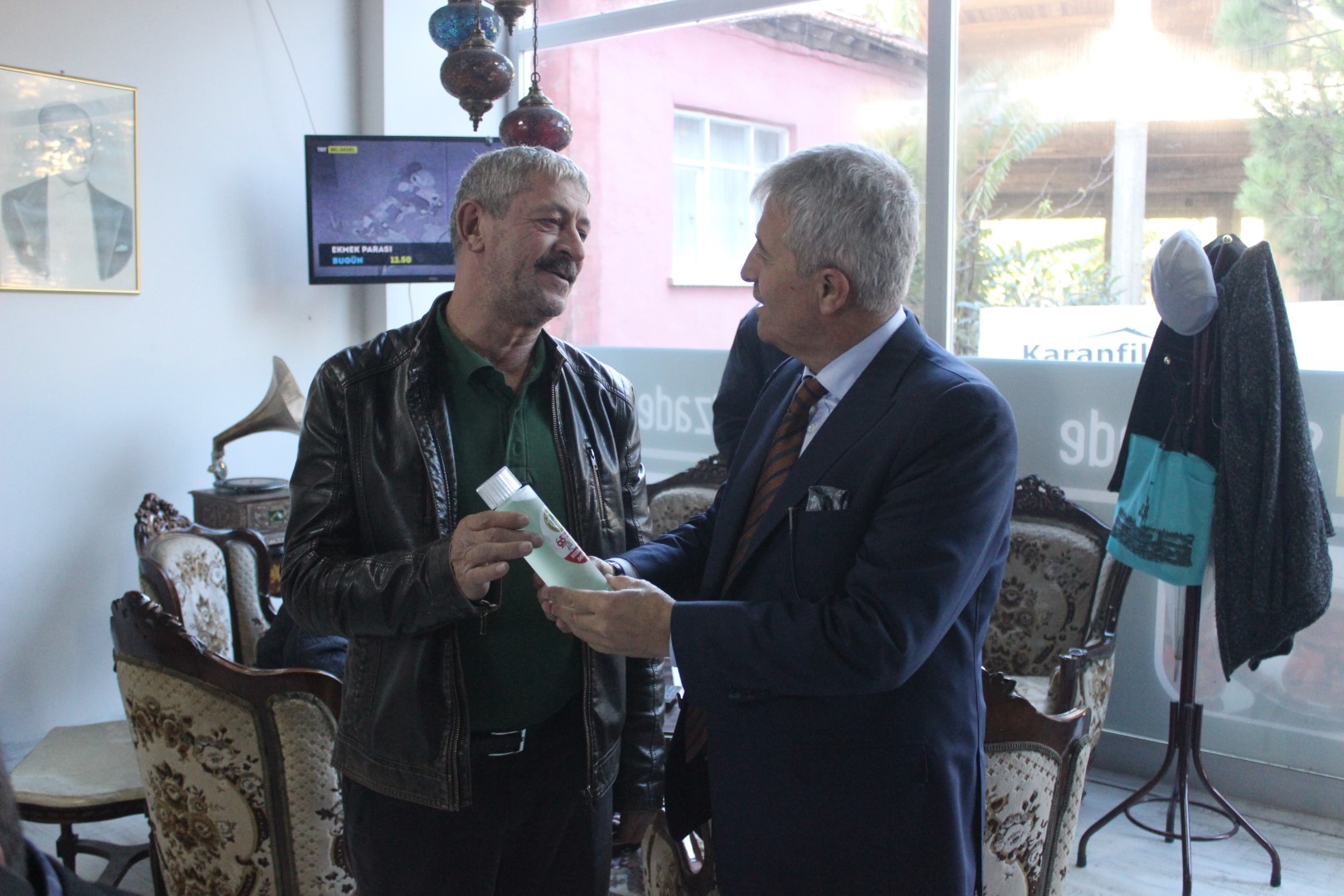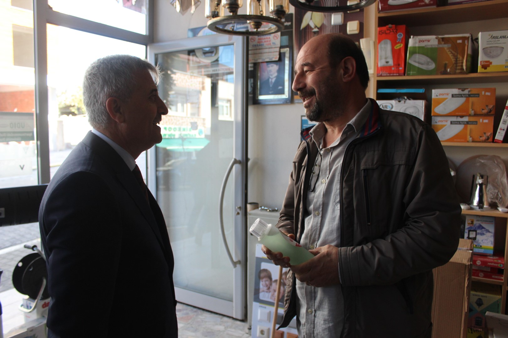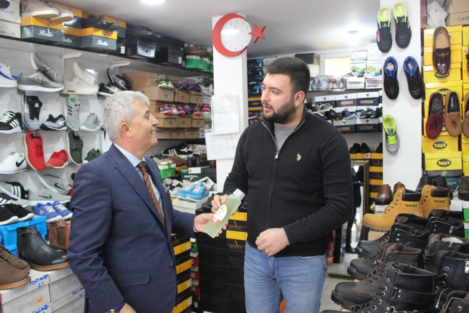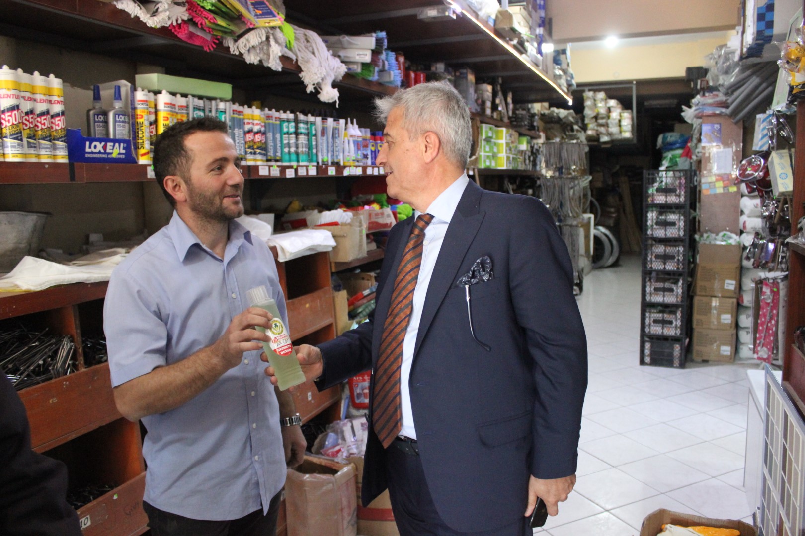 Tüm esnafları tek tek dolaşan Belediye Başkanı Ahmet Soğuk, esnaflara kolonya dağıtarak, Cumhuriyet Bayramı’nı kutladı.
