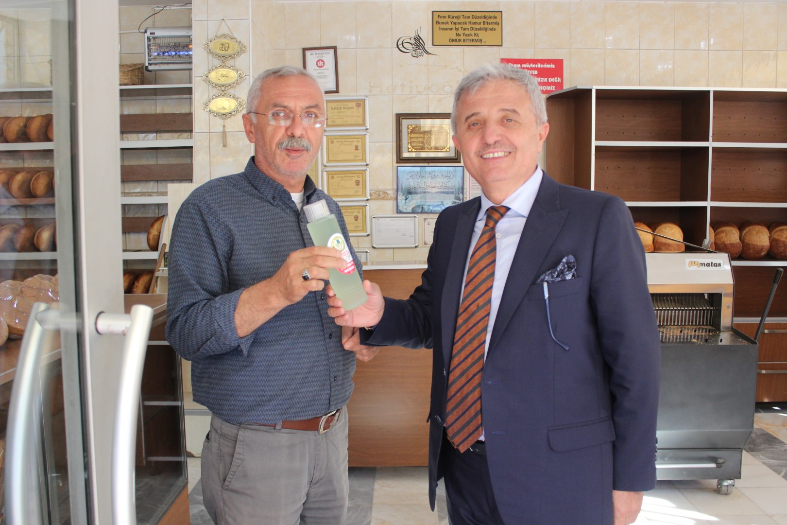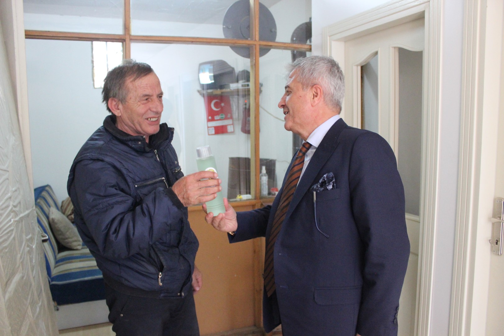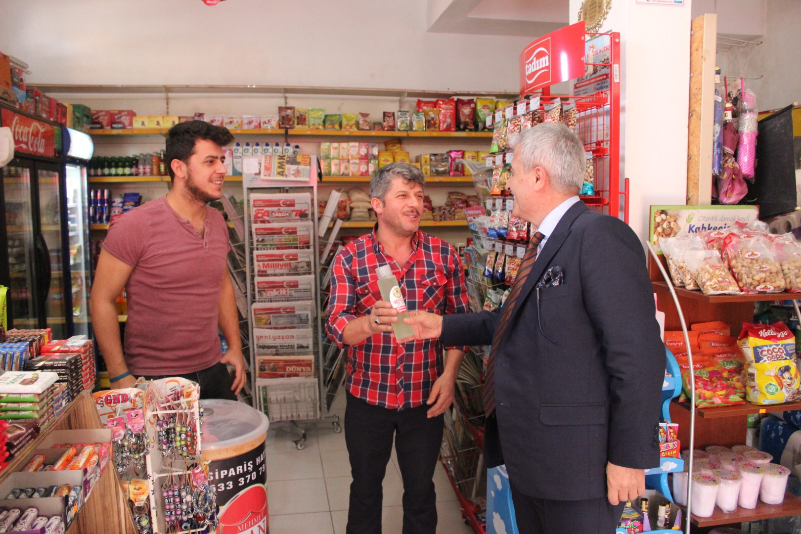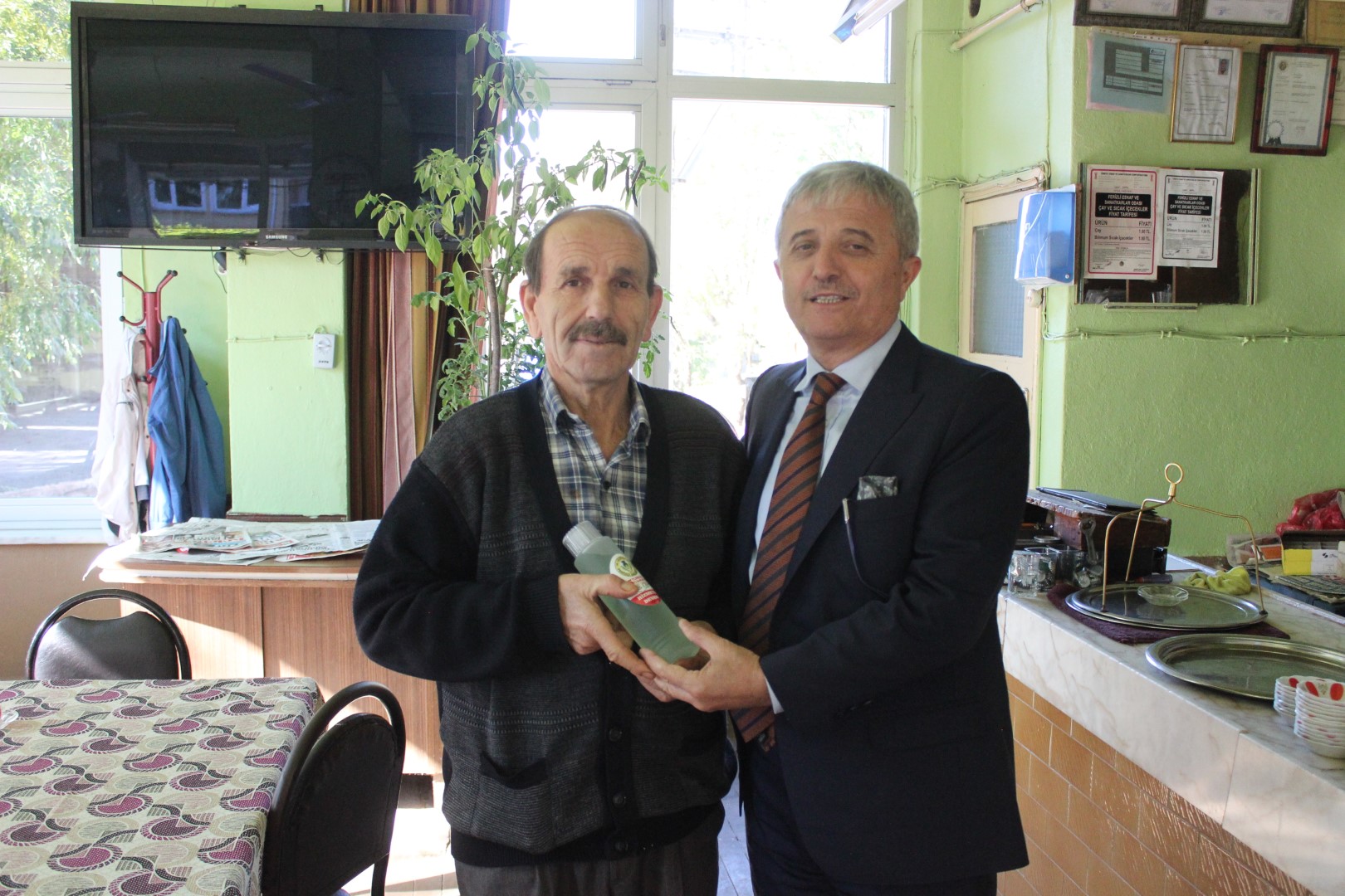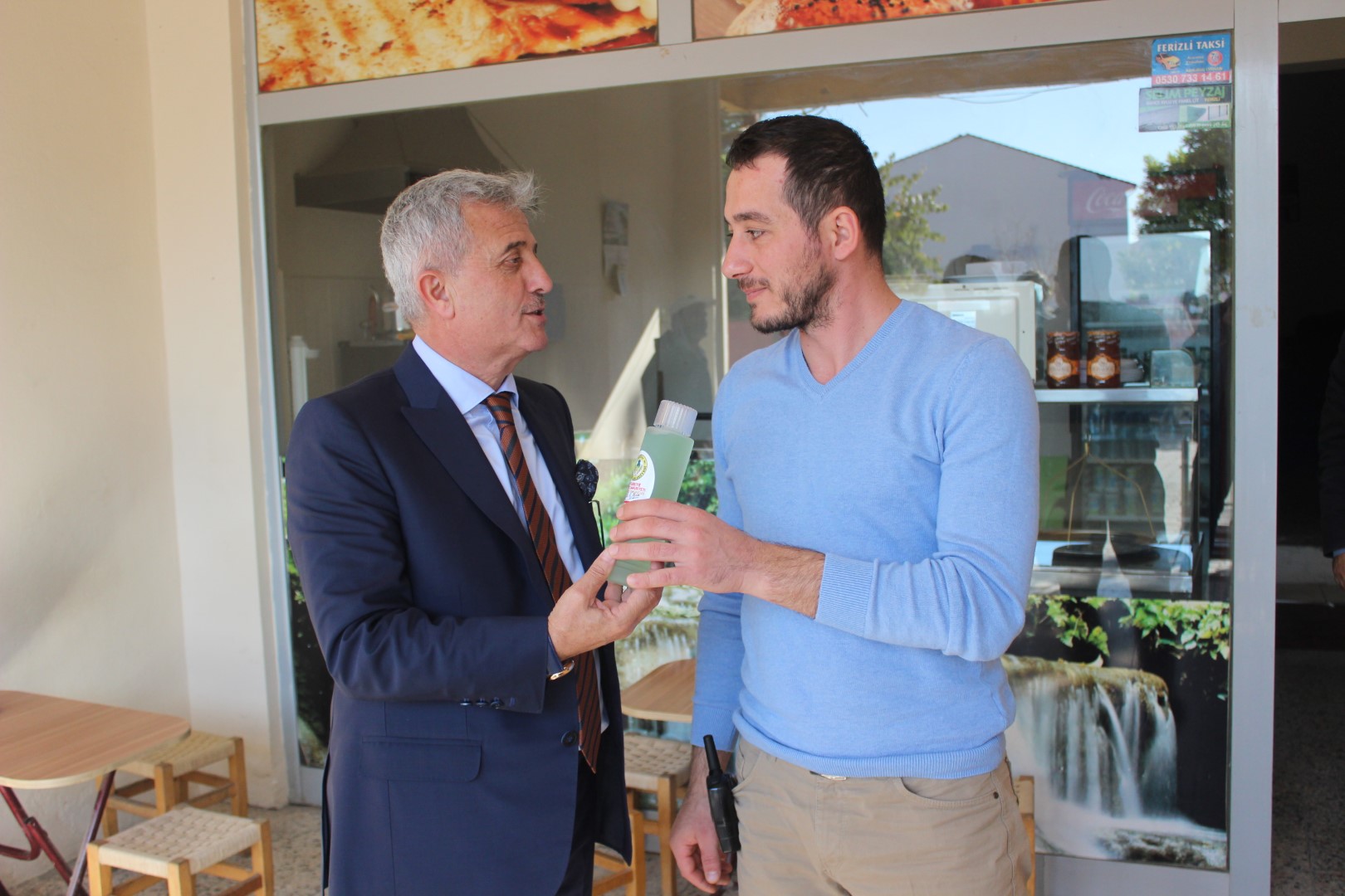 Tüm esnafları tek tek dolaşan Belediye Başkanı Ahmet Soğuk, esnaflara kolonya dağıtarak, Cumhuriyet Bayramı’nı kutladı.
