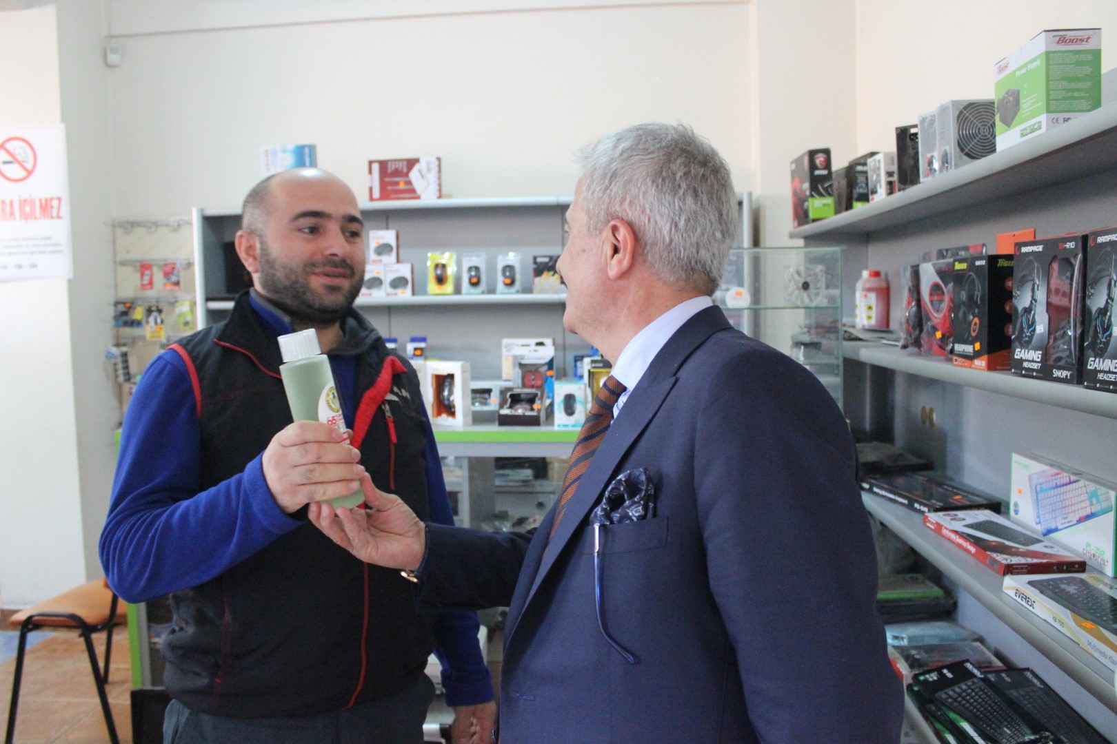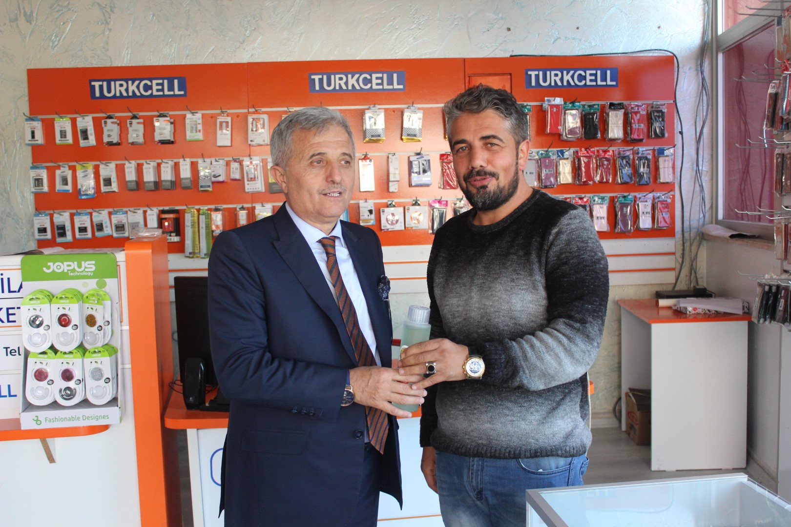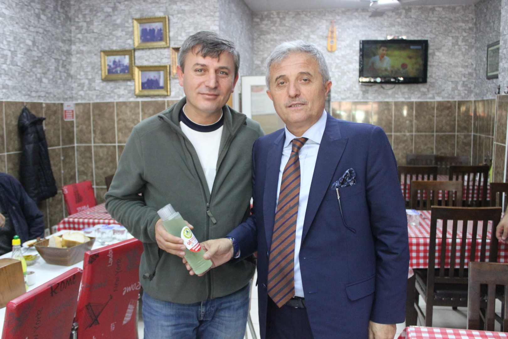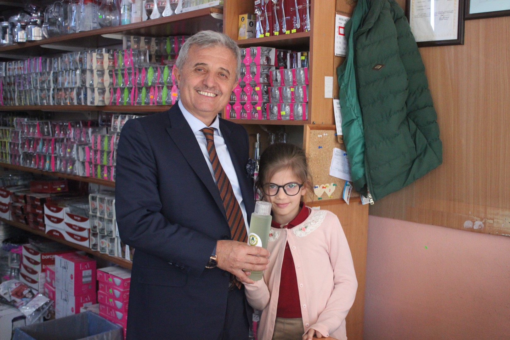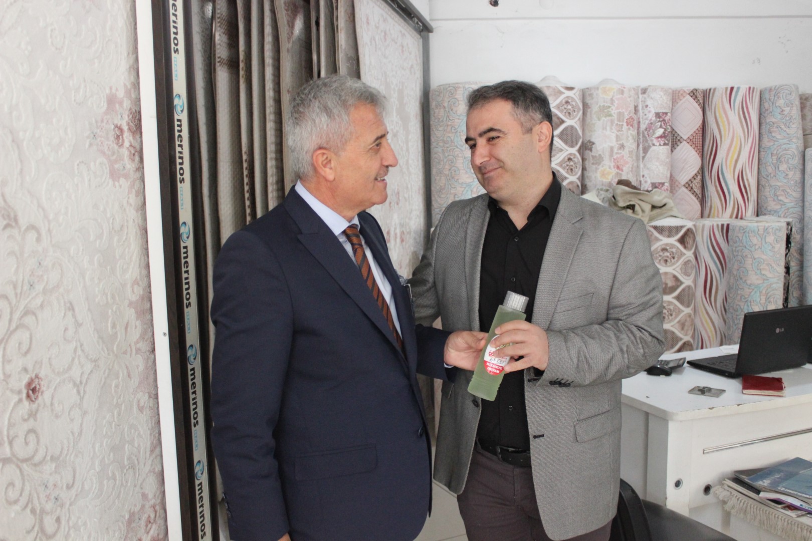 Tüm esnafları tek tek dolaşan Belediye Başkanı Ahmet Soğuk, esnaflara kolonya dağıtarak, Cumhuriyet Bayramı’nı kutladı.
