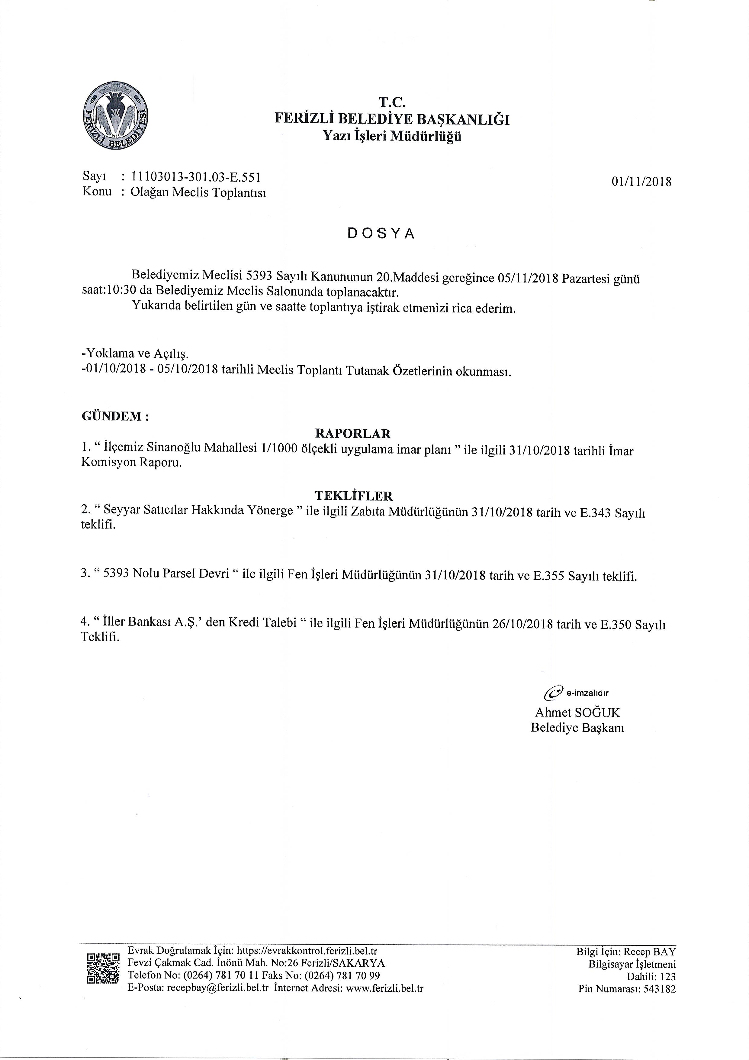 Ferizli Belediyesi KASIM Ayı Meclis Gündemi (05 Kasım 2018 Pazartesi)