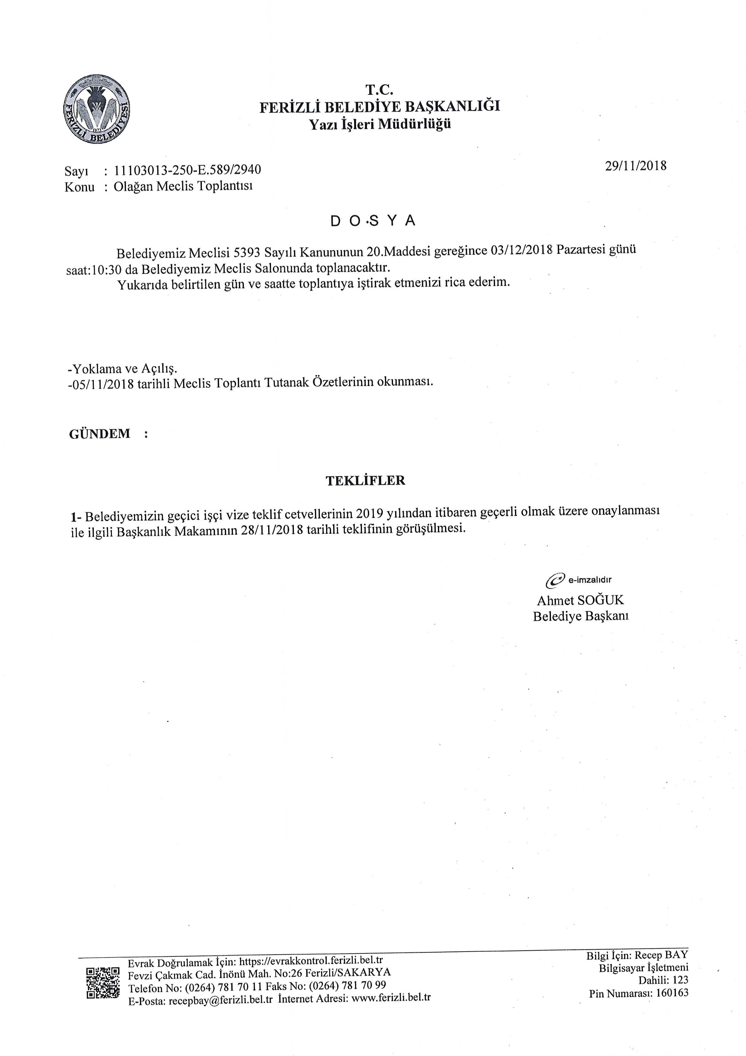 Ferizli Belediyesi ARALIK Ayı Meclis Gündemi (03 Aralık 2018 Pazartesi)