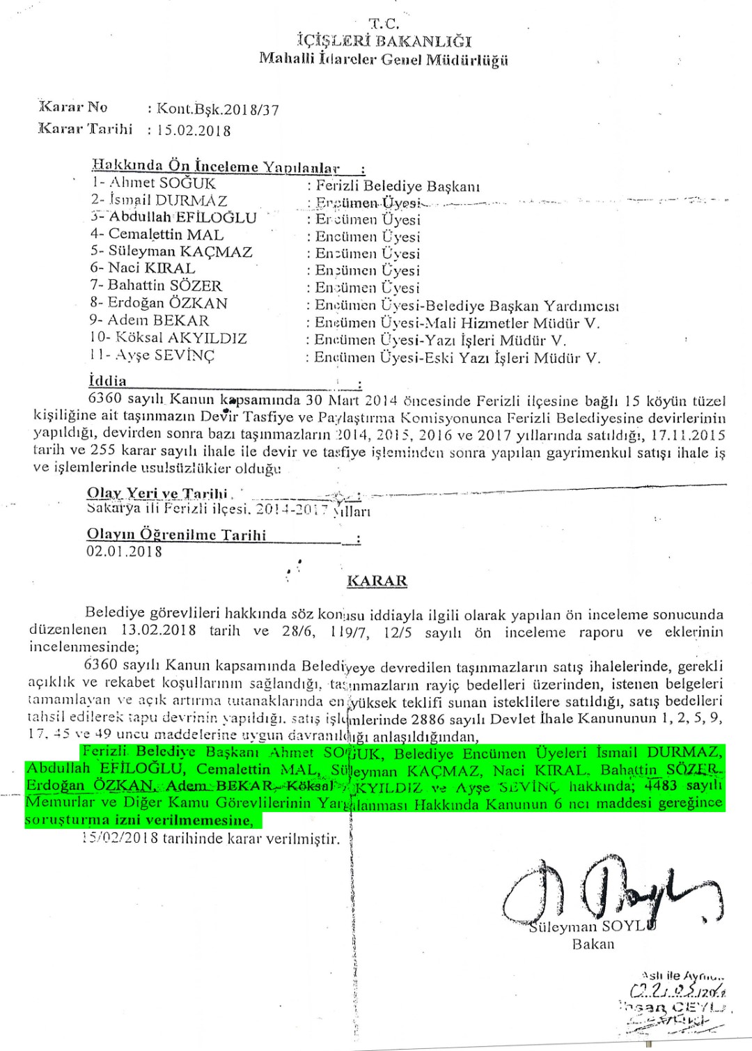İsteğimizle Ankara’dan gelen mülkiye müfettişleri Ferizli Belediye’mizin 2014-2015-2016-2017 yıllarını kapsayan tüm ihalelerini incelediler ve bakanlığa sundular. Araştırma sonucu olarak, 2014-2015-2016-2017 yılında yapılan tüm ihalelerde bilerek ya da bilmeyerek hiçbir eksiklik, yolsuzluk ve usulsüzlük olmadığı belgelerle ortaya kondu.