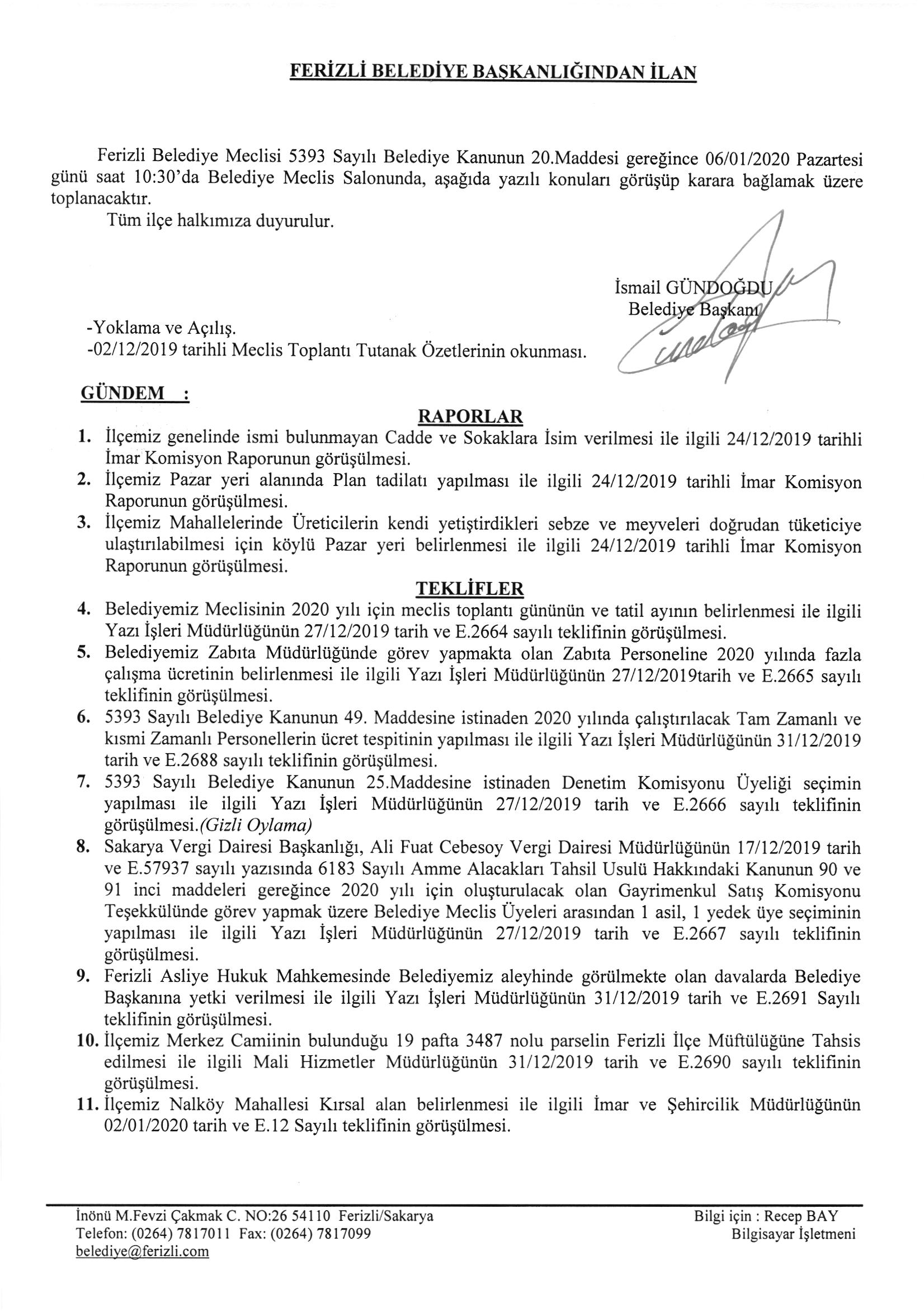 Ferizli Belediyesi Ocak Ayı Meclis Gündemi (06.01.2020 Pazartesi)