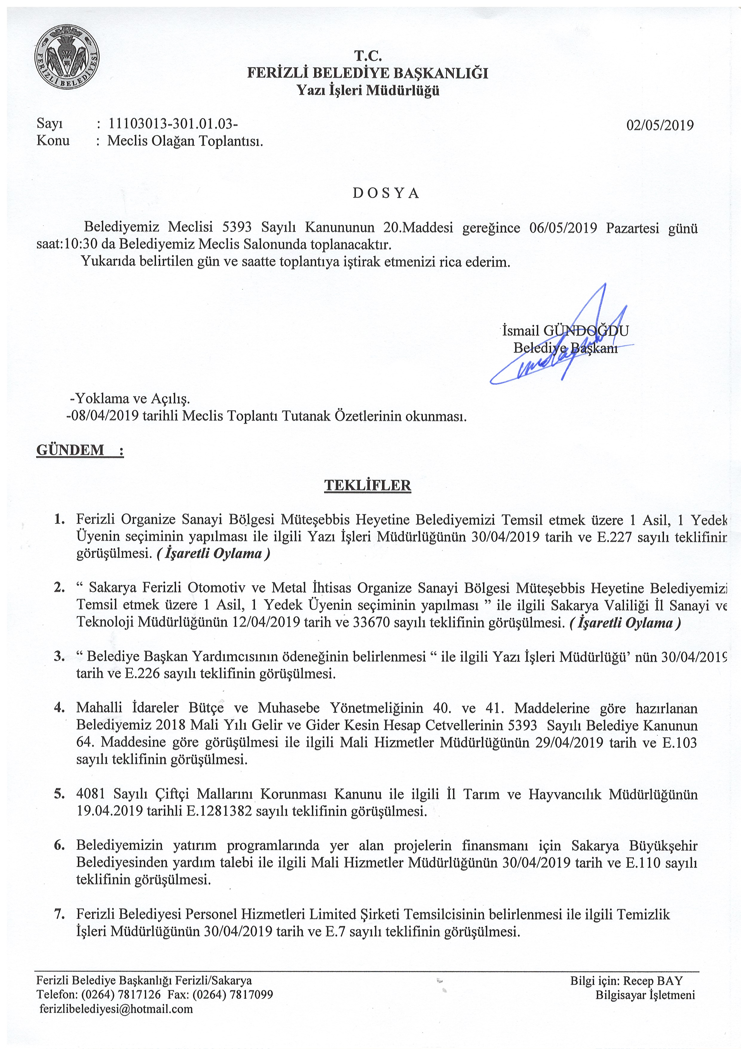 Ferizli Belediyesi Mayıs Ayı Meclis Gündemi (06.05.2019 Pazartesi)