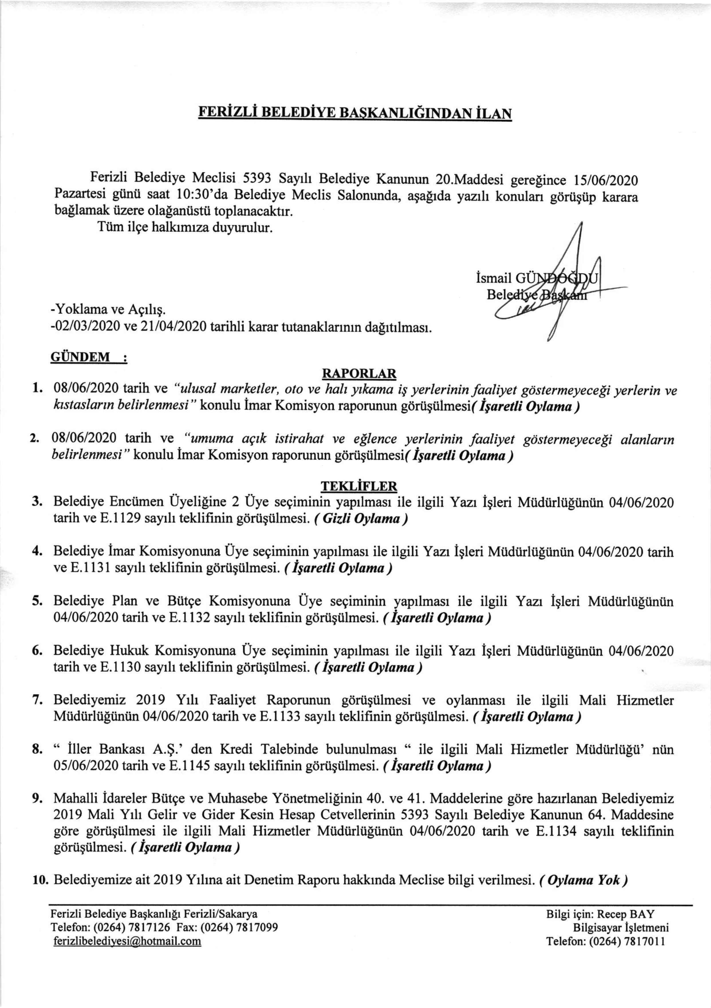 Ferizli Belediyesi Haziran Ayı Meclis Gündemi (15.06.2020 Pazartesi)