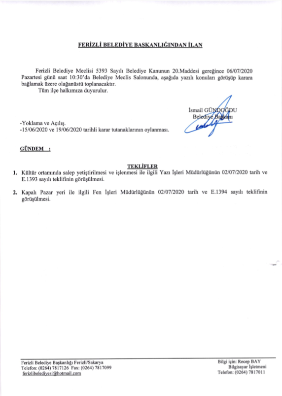 Ferizli Belediyesi Temmuz Ayı Meclis Gündemi (06.07.2020 Pazartesi)