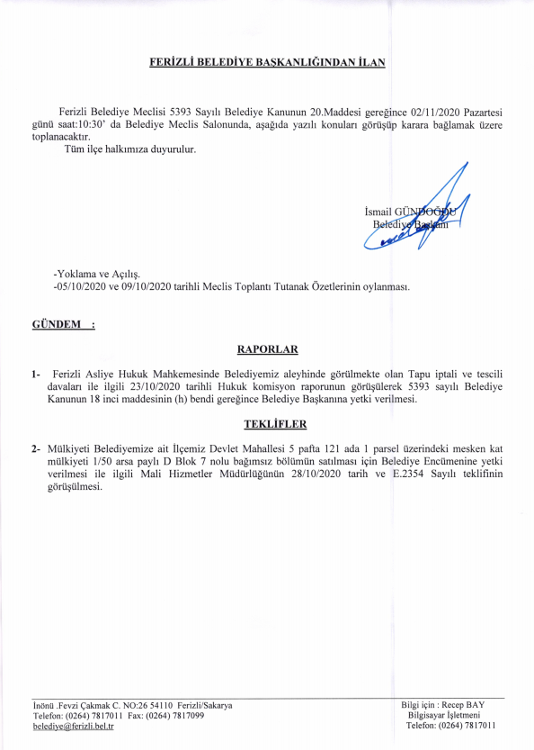 Ferizli Belediyesi Kasım Ayı Meclis Gündemi (02.11.2020 Pazartesi)
