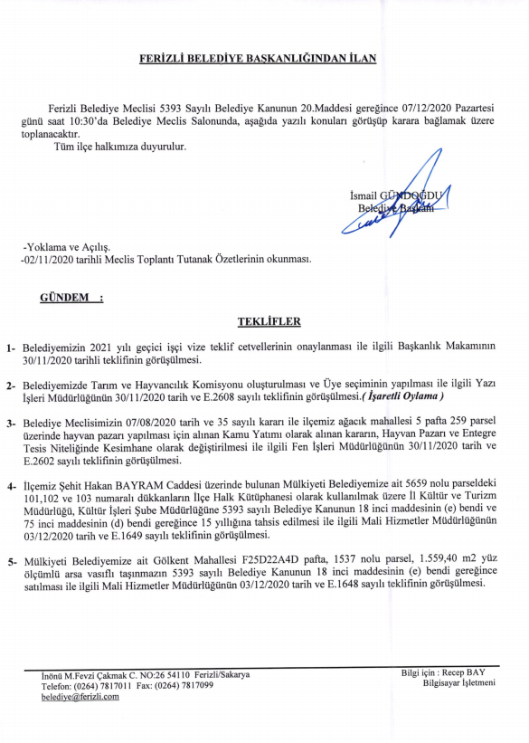 Ferizli Belediyesi Aralık Ayı Meclis Gündemi (07.12.2020 Pazartesi)