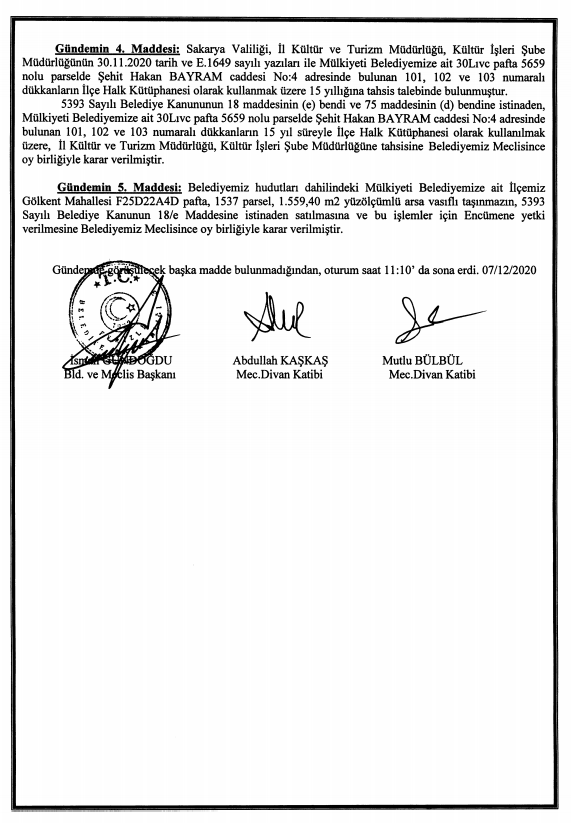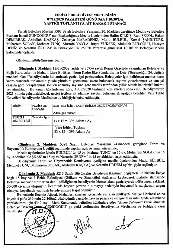 Ferizli Belediyesi Aralık Ayı Meclis Kararları (07.12.2020 Pazartesi)