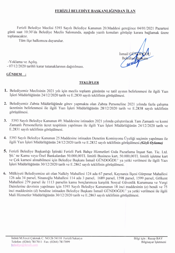 Ferizli Belediyesi Ocak Ayı Meclis Gündemi (04.01.2021 Pazartesi)
