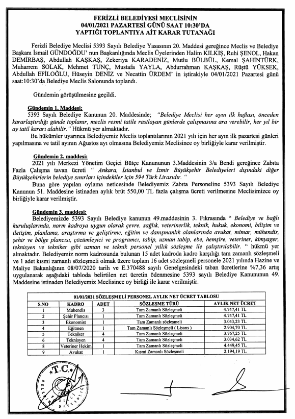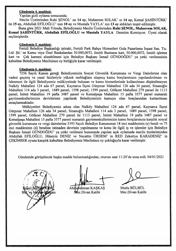 Ferizli Belediyesi Ocak Ayı Meclis Kararları (04.01.2021 Pazartesi)
