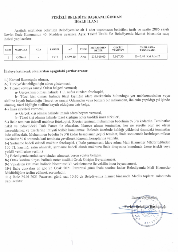 FERİZLİ BELEDİYESİ İHALE İLANI