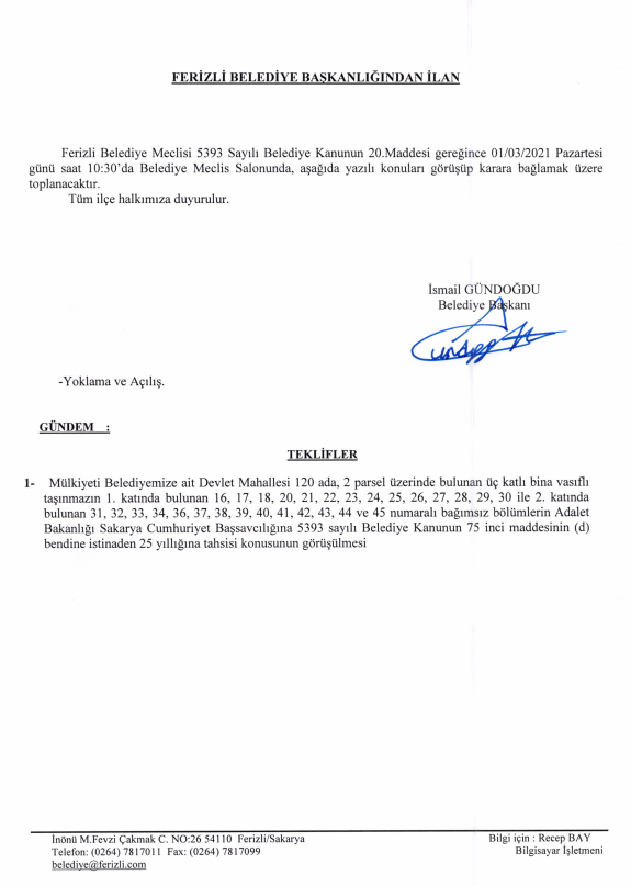 Ferizli Belediyesi Şubat Ayı Meclis Gündemi (26.02.2021 Pazartesi)