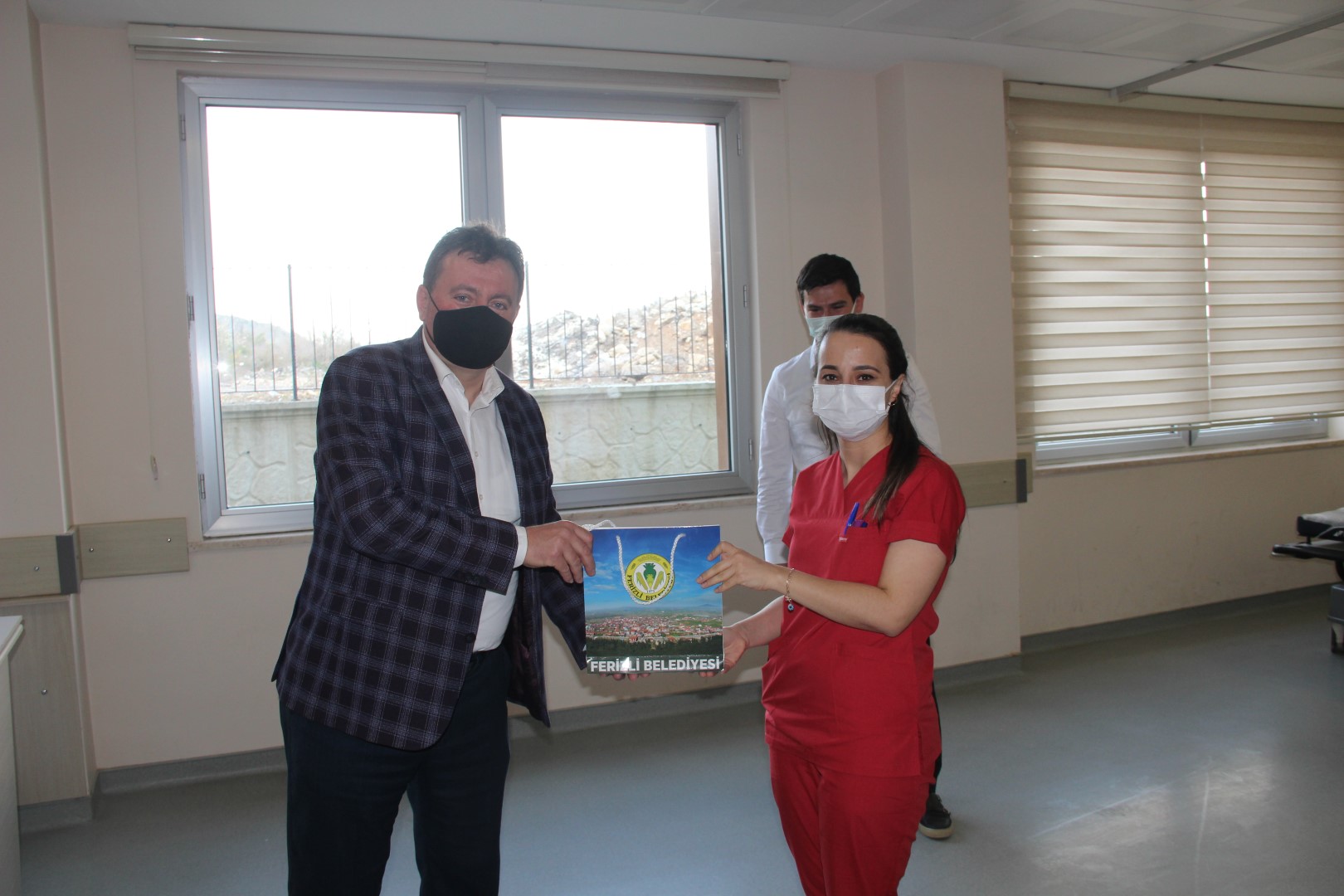 Ferizli İlçe Devlet Hastanesi Başhekimi Uz. Dr. Samet Kaymaz, İdari ve Mali İşler Müdürü Muhammet Durmaz ve sağlık çalışanlarına günün anısına hediye de takdim eden Belediye Başkanımız İsmail Gündoğdu şunları kaydetti: