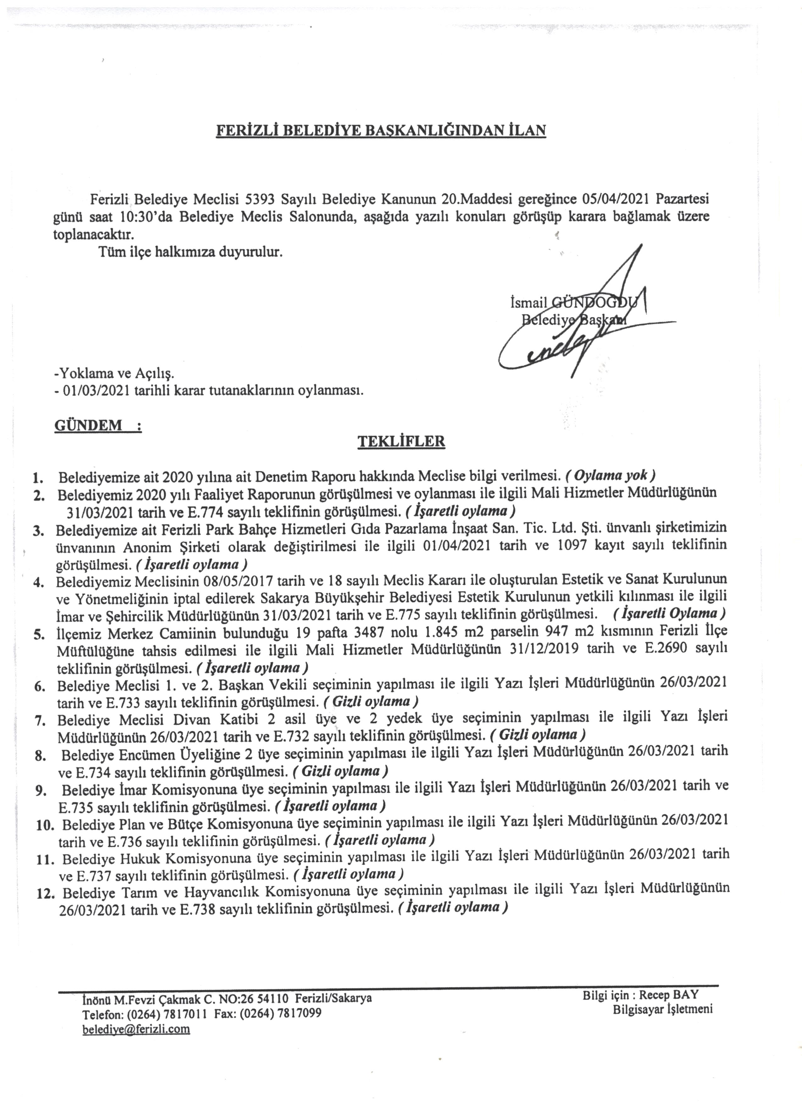 Ferizli Belediyesi Nisan Ayı Meclis Gündemi (05.04.2021 Pazartesi)