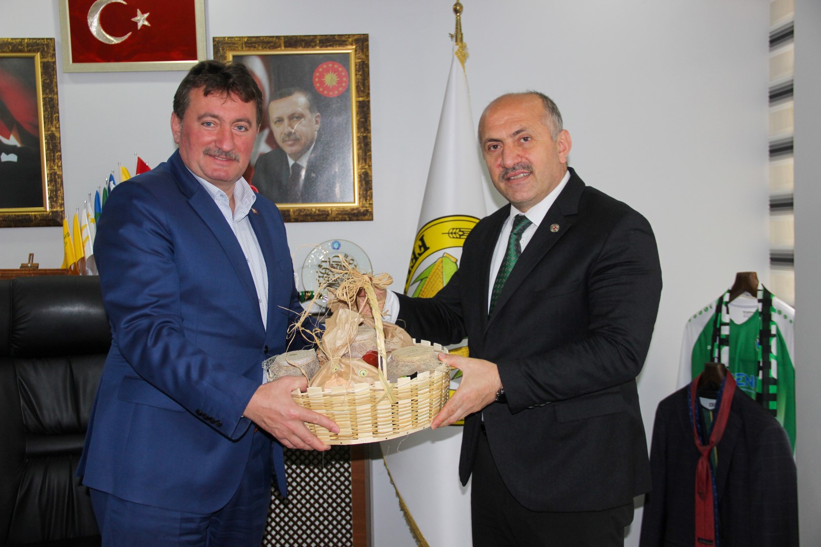 Başkanımız Gündoğdu, Başkan Çiftçi’ye içerisinde yöresel ürünlerin bulunduğu hediye takdim etti ve birlikte hatıra fotoğrafı çektirdiler.