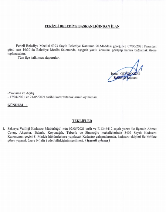 Ferizli Belediyesi Haziran Ayı Meclis Gündemi (07.06.2021 Pazartesi)