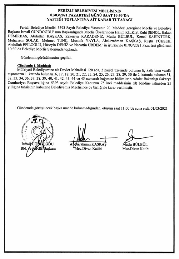 Ferizli Belediyesi Şubat Ayı Meclis Kararları (26.02.2021 Pazartesi)