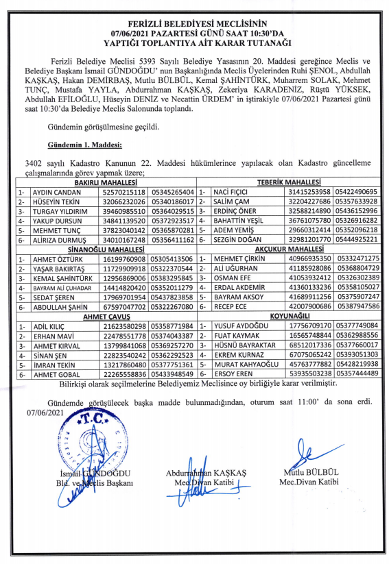 Ferizli Belediyesi Haziran Ayı Meclis Kararları (07.06.2021 Pazartesi)