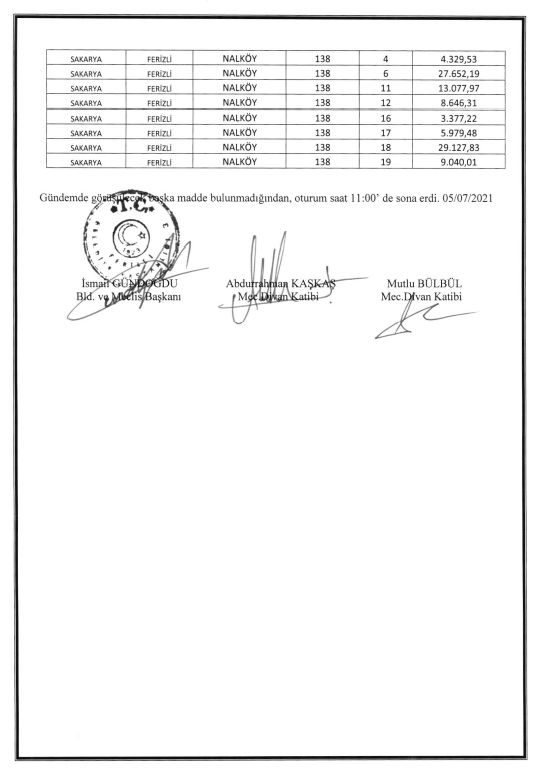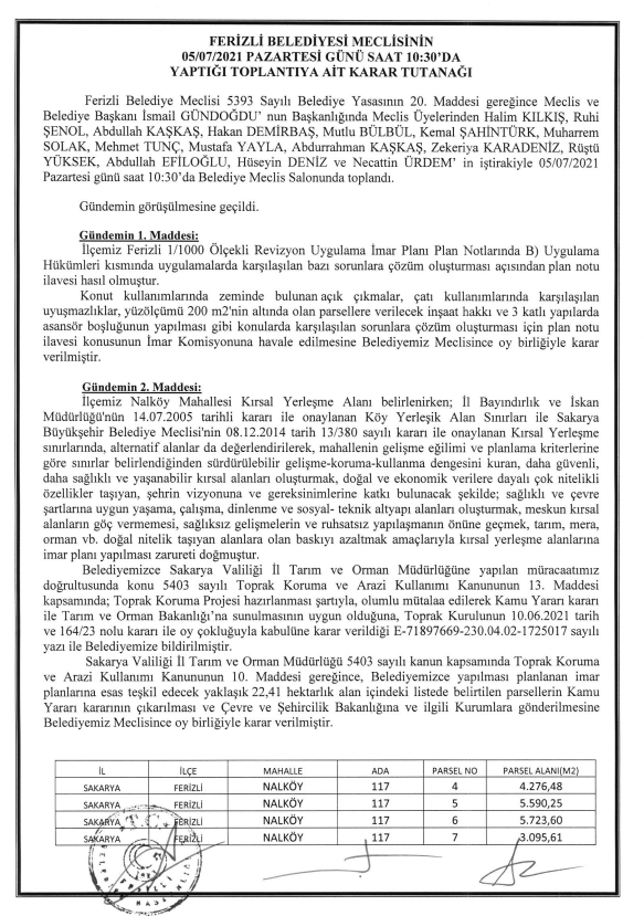 Ferizli Belediyesi Temmuz Ayı Meclis Kararları (05.07.2021 Pazartesi)