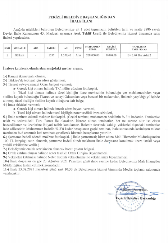 FERİZLİ BELEDİYESİ İHALE İLANI