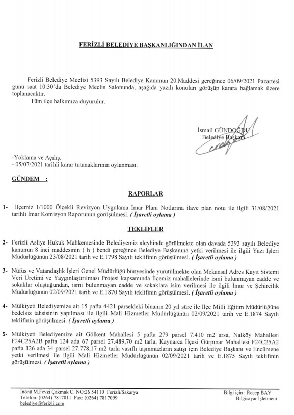 Ferizli Belediyesi Eylül Ayı Meclis Gündemi (06.09.2021 Pazartesi)