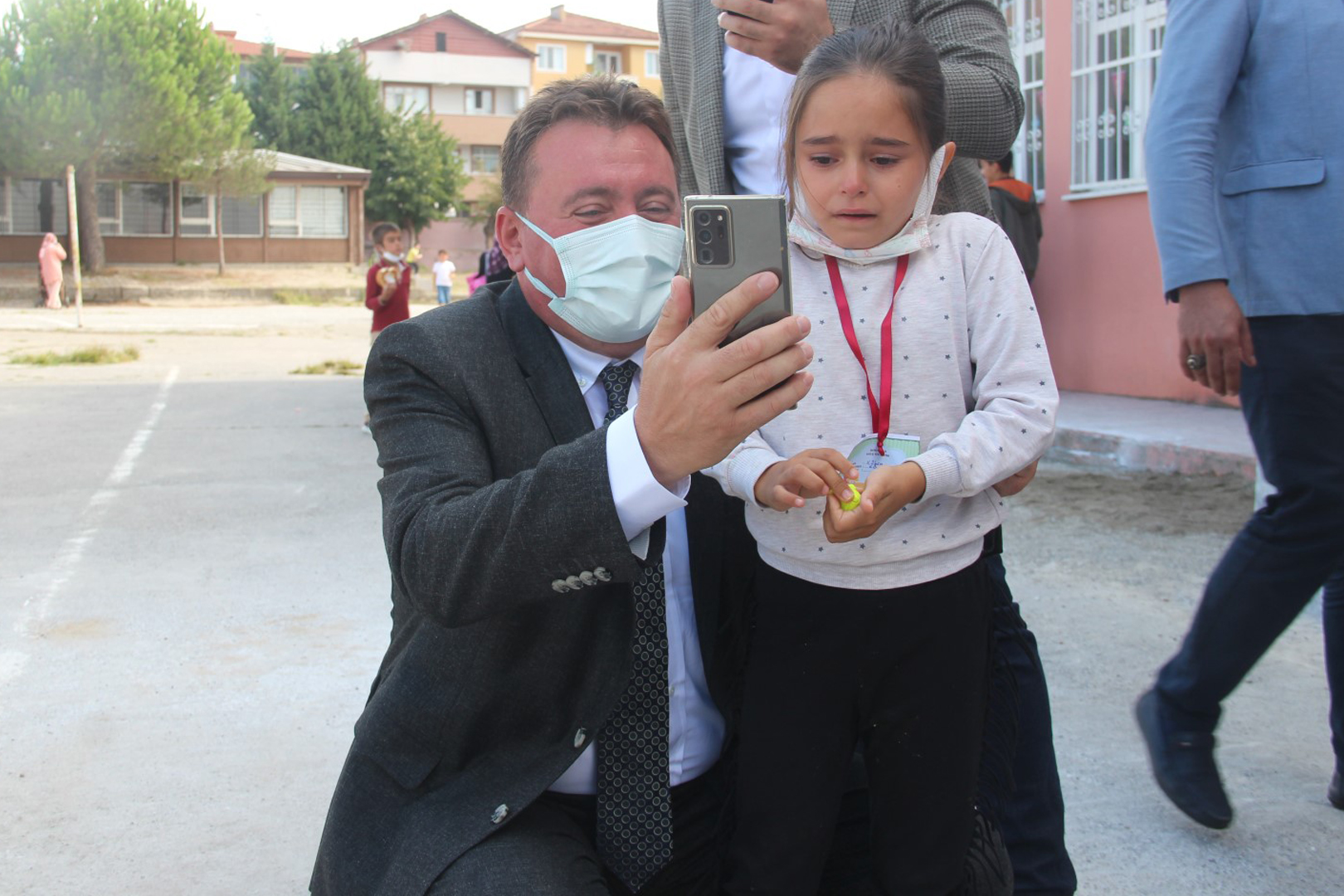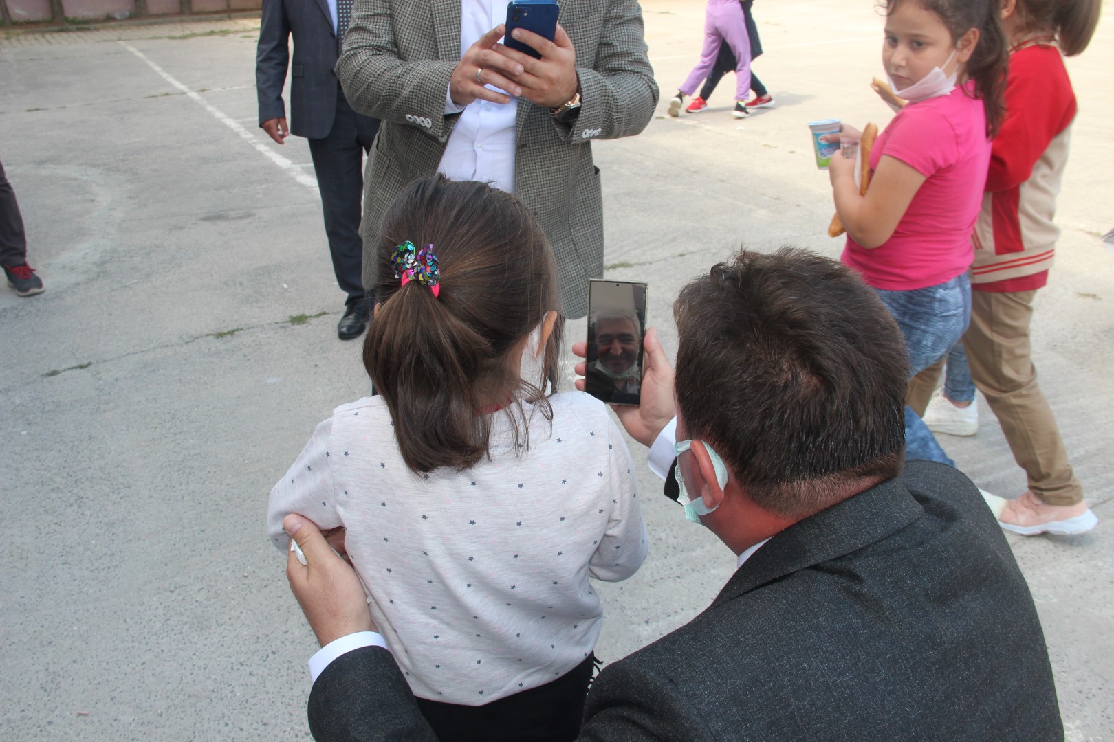 Başkanımız Gündoğdu, teneffüs esnasında okul bahçesinde öğrencilerle sohbet ederken, ilkokul birinci sınıfa yeni başlayan küçük bir kız çocuğunun üzgün olduğunu fark etti. Küçük kızın durumuyla yakından ilgilenen Başkan Gündoğdu, kız çocuğuyla bir süre sohbet edip yatıştırdıktan sonra neden üzgün olduğunu sordu. Küçük kız ailemi çok özledim deyince Başkanımız Gündoğdu, kızın babasının telefon numarasına ulaştı. Baba ve kızını bir süre görüntülü olarak görüştürdü. Kız babasını karşısında görünce, yüzündeki üzüntü yerini mutlu bir tebessüme bıraktı.