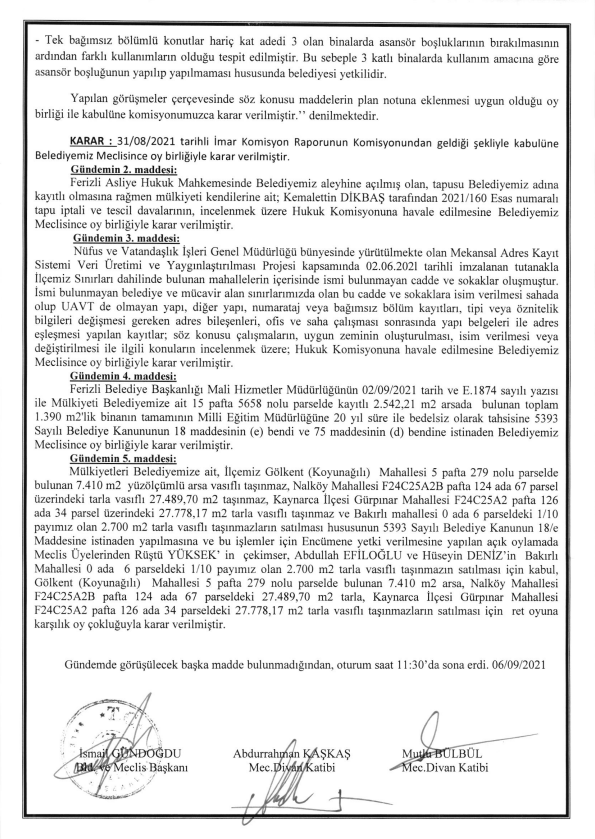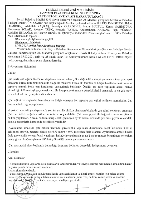 Ferizli Belediyesi Eylül Ayı Meclis Kararları (06.09.2021 Pazartesi)